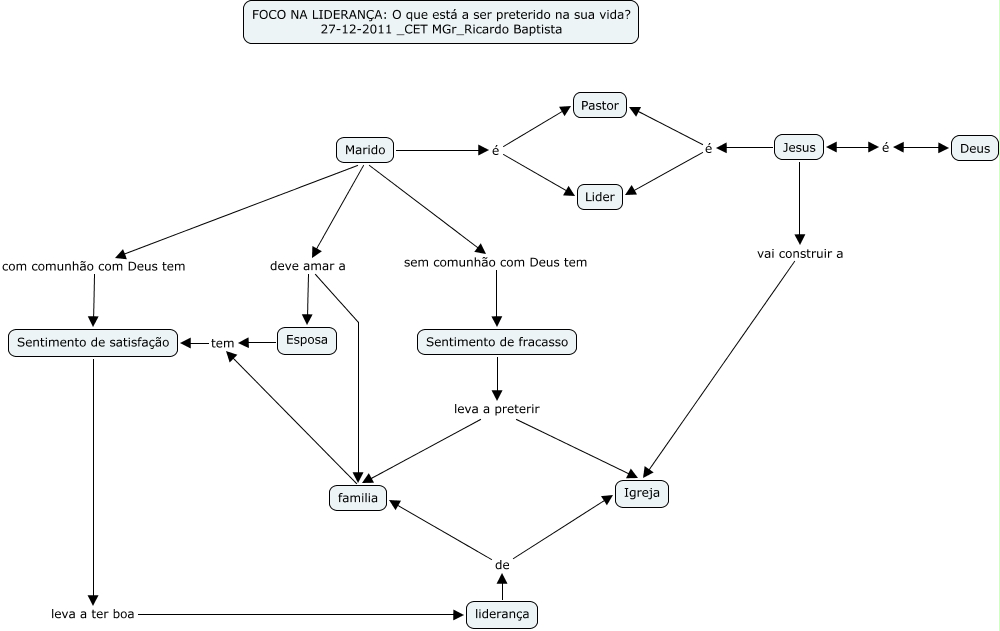 Esse mapa conceitual, produzido no IHMC CmapTools, tem a informação relacionada a: FOCO NA LIDERANÇA_27-12-2011 _CET MGr_Ricardo Baptista, liderança de familia, Marido deve amar a familia, Marido é Pastor, Sentimento de satisfação leva a ter boa liderança, Jesus é Pastor, Sentimento de fracasso leva a preterir Igreja, familia tem Sentimento de satisfação, Sentimento de fracasso leva a preterir familia, Deus é Jesus, Marido sem comunhão com Deus tem Sentimento de fracasso, Marido deve amar a Esposa, Marido com comunhão com Deus tem Sentimento de satisfação, Jesus vai construir a Igreja, Marido é Lider, Jesus é Lider, Esposa tem Sentimento de satisfação, liderança de Igreja