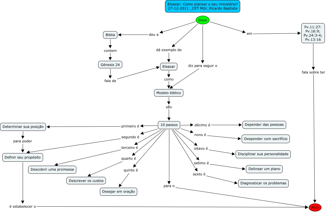 Esse mapa conceitual, produzido no IHMC CmapTools, tem a informação relacionada a: Eliazar_Como planear o seu ministério 27-12-2011 _CET MGr_Ricardo Baptista, Deus em Pv.11:27: Pv.16:9; Pv.24:3-4; Pv.13:16, Deus dá exemplo de Eleazar, 10 passos quarto é Descrever os custos, 10 passos setimo é Delinear um plano, Deus diz para seguir o Modelo biblico, Deus deu a Biblia, 10 passos sexto é Diagnosticar os problemas, 10 passos segundo é Definir seu propósito, 10 passos décimo é Depender das pessoas, 10 passos oitavo é Disciplinar sua personalidade, Eleazar como Modelo biblico, Génesis 24 fala de Eleazar, 10 passos para o Alvo, Pv.11:27: Pv.16:9; Pv.24:3-4; Pv.13:16 fala sobre ter Alvo, Determinar sua posição para poder Definir seu propósito, 10 passos nono é Despender com sacrifício, Modelo biblico são 10 passos, Definir seu propósito é estabelecer o Alvo, 10 passos terceiro é Descobrir uma promessa, 10 passos primeiro é Determinar sua posição