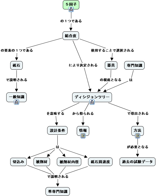 このコンセプトマップに関連する情報: 基本 結合度, ディシジョンツリー で導出される 方法, ディシジョンツリー を意味する 設計条件, 結合度 により決定される ディシジョンツリー, 設計条件 は 砥石周速度, 設計条件 は 被削材内径, 結合度 使用することで選択される 器具, 設計条件 は 切込み, 結合度 の要素の1つである 砥石, 器具 の根底となる ディシジョンツリー, 方法 が必要となる 過去の試験データ, ディシジョンツリー から得られる 情報, 被削材 で説明される 準専門知識, 5因子 の1つである 結合度, 設計条件 は 被削材, 被削材内径 で説明される 準専門知識, 砥石 で説明される 一般知識, 切込み で説明される 準専門知識, 専門知識 は ディシジョンツリー, 砥石周速度 で説明される 準専門知識