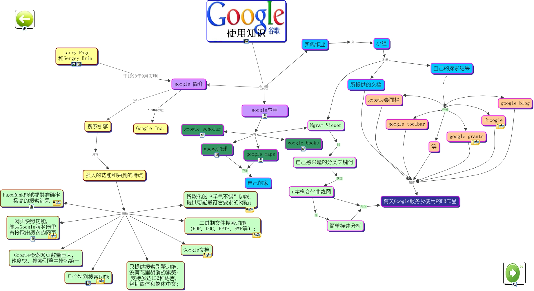 此概念图以 IHMC CmapTools 创建, 内含信息有关于: 第七专题google 使用, 小组 利用 Ngram Viewer, google应用 有 Ngram Viewer, 等 制作 有关Google服务及使用的PB作品, google grants 制作 有关Google服务及使用的PB作品, google桌面栏 制作 有关Google服务及使用的PB作品, google应用 有 google books, google应用 有 googe地球, 使用知识 包括 google应用, google 简介 1999年创立 Google Inc., 强大的功能和独到的特点 包括 Google文档, 强大的功能和独到的特点 包括 只提供搜索引擎功能, 没有花里胡哨的累赘; 支持多达132种语言, 包括简体和繁体中文;, 强大的功能和独到的特点 包括 几个特别搜索功能, 强大的功能和独到的特点 包括 二进制文件搜索功能 (PDF,DOC,PPTS,SWF等);, 小组 利用 所提供的文档, 所提供的文档 制作 有关Google服务及使用的PB作品, 简单描述分析 加入 有关Google服务及使用的PB作品, 自己感兴趣的分类关键词 获取 n字格变化曲线图, Ngram Viewer 以 自己感兴趣的分类关键词, google maps 寻找 自己的家, googe地球 寻找 自己的家