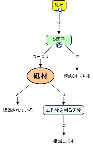 このコンセプトマップに関連する情報: 砥材について, 工作物を削る刃物 に 相当します, 砥材 と 認識されている, 砥材 は 工作物を削る刃物, 5因子 で 構成されている, 砥石 は 5因子, 5因子 の一つは 砥材