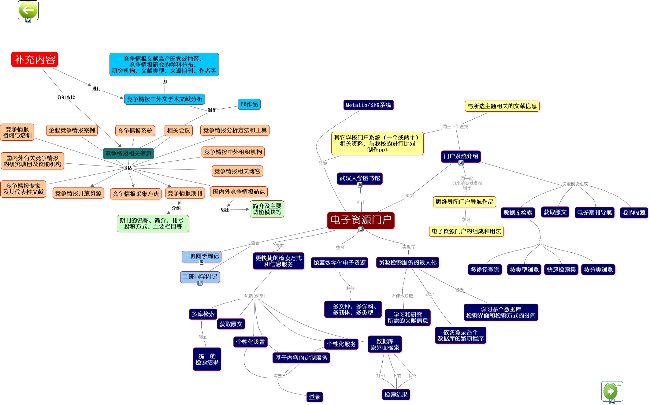 此概念图以 IHMC CmapTools 创建, 内含信息有关于: 第十四专题 电子资源门户, 门户系统介绍 功能模块组成 数据库检索, 电子资源门户 学习 门户系统介绍, 电子资源门户 实现了 资源检索服务的最大化, 更快捷的检索方式 和信息服务 包括(例举) 获取原文, 多库检索 得到 统一的 检索结果, 门户系统介绍 周三下午查找 与所选主题相关的文献信息, 竞争情报相关信息 包括 企业竞争情报案例, 竞争情报相关信息 包括 竞争情报采集方法, 思维导图门户导航作品 学习 电子资源门户的组成和用法, 资源检索服务的最大化 方便地获取 学习和研究 所需的文献信息, 数据库 原界面检索 打印 检索结果, 竞争情报相关信息 包括 相关会议, 竞争情报相关信息 包括 竞争情报开放资源, 数据库检索 分 多途径查询, 武汉大学图书馆 推出 电子资源门户, 数据库 原界面检索 保存 检索结果, 个性化服务 需要 登录, 电子资源门户 提供 更快捷的检索方式 和信息服务, 竞争情报相关信息 包括 竞争情报期刊, 竞争情报期刊 介绍 期刊的名称、简介、刊号 投稿方式、主要栏目等