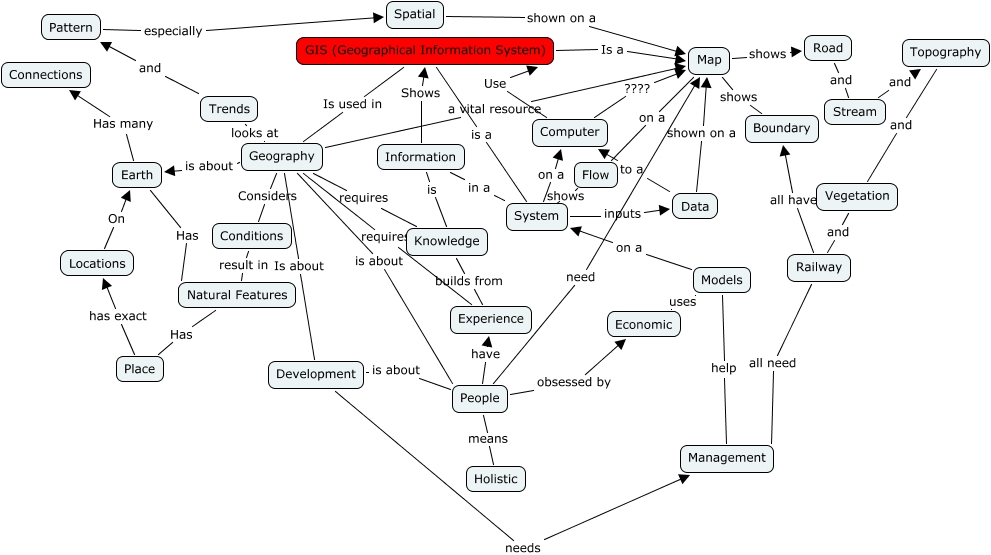 This Concept Map, created with IHMC CmapTools, has information related to: GISCMAP, Development needs Management, People need Map, Computer ???? Map, Data to a Computer, GIS (Geographical Information System) is a System, Map shows Boundary, Computer Use GIS (Geographical Information System), Place has exact Locations, System inputs Data, Natural Features Has Place, Conditions result in Natural Features, Earth Has many Connections, People have Experience, Trends and Pattern, Road and Stream, Railway all have Boundary, Information in a System, Models help Management, System on a Computer, Geography requires Experience