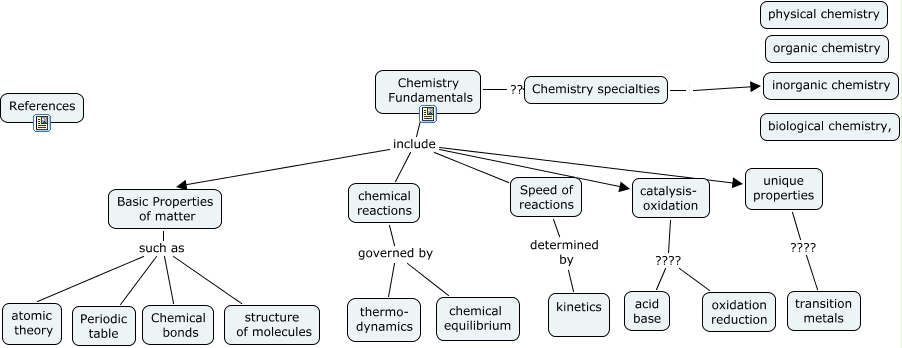 Este Cmap, tiene información relacionada con: Fundamentals of Chemistry, Speed of reactions determined by kinetics, Basic Properties of matter such as structure of molecules, Basic Properties of matter such as Chemical bonds, Chemistry specialties inorganic chemistry, catalysis- oxidation ???? acid base, Basic Properties of matter such as Periodic table, Chemistry Fundamentals include catalysis- oxidation, unique properties ???? transition metals, chemical reactions governed by thermo- dynamics, Chemistry Fundamentals include Basic Properties of matter, catalysis- oxidation ???? oxidation reduction, Chemistry Fundamentals ???? Chemistry specialties, Chemistry Fundamentals include unique properties, chemical reactions governed by chemical equilibrium, Chemistry Fundamentals include chemical reactions, Basic Properties of matter such as atomic theory, Chemistry Fundamentals include Speed of reactions