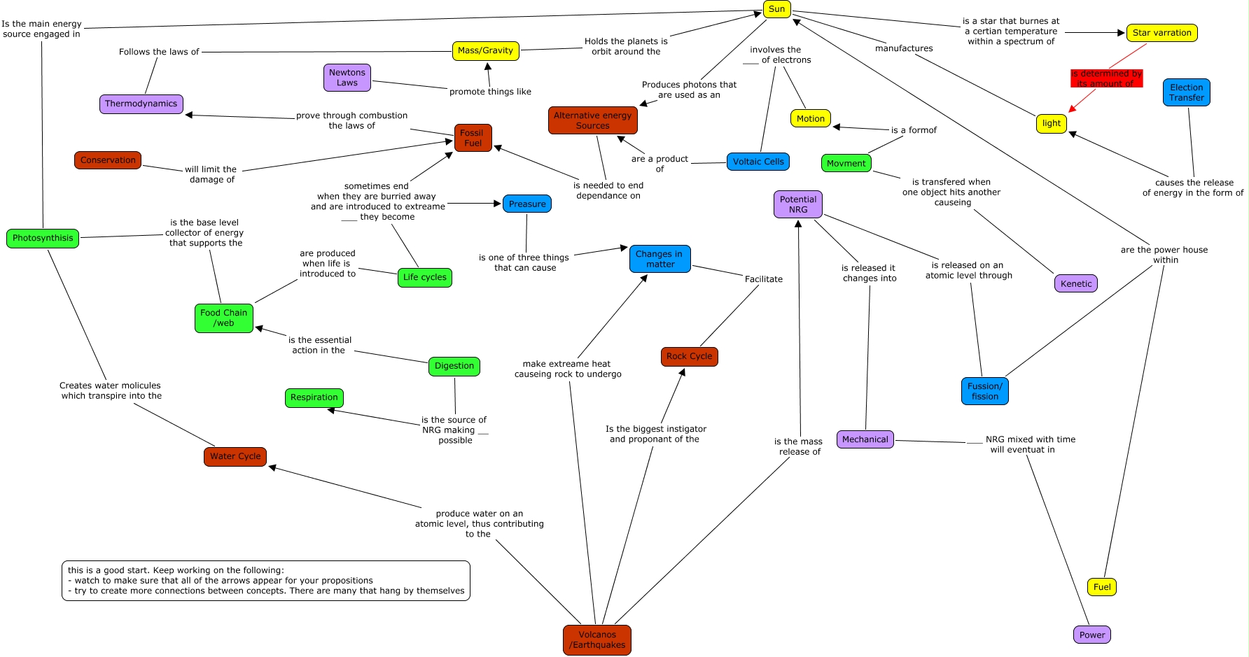 This Concept Map, created with IHMC CmapTools, has information related to: Dennis_NRG, Life cycles sometimes end when they are burried away and are introduced to extreame ___ they become Preasure, Star varration is determined by its amount of light, Movment is transfered when one object hits another causeing Kenetic, Election Transfer causes the release of energy in the form of light, Mass/Gravity Holds the planets is orbit around the Sun, Alternative energy Sources is needed to end dependance on Fossil Fuel, Mechanical ___ NRG mixed with time will eventuat in Power, Life cycles are produced when life is introduced to Food Chain /web, Potential NRG is released it changes into Mechanical, Sun manufactures light, Movment is a formof Motion, Changes in matter Facilitate Rock Cycle, Newtons Laws promote things like Mass/Gravity, Digestion is the essential action in the Food Chain /web, Volcanos /Earthquakes make extreame heat causeing rock to undergo Changes in matter, Photosynthisis Creates water molicules which transpire into the Water Cycle, Fussion/ fission are the power house within Sun, Fussion/ fission are the power house within Fuel, Conservation will limit the damage of Fossil Fuel, Sun Is the main energy source engaged in Photosynthisis