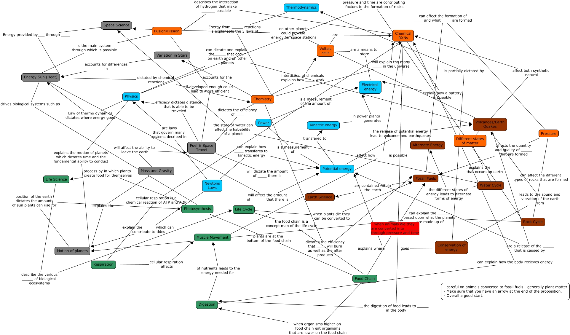 This Concept Map, created with IHMC CmapTools, has information related to: Hans, Raya, Brad num 2, Photosynthesis process by in which plants create food for themselves Life Science, Chemistry will explain the many ____ in the universe Chemical RXNs, Different states of matter affect both synthetic natural Chemical RXNs, Variation in Stars accounts for differences in Energy Sun (Heat), Pressure can affect the formation of ____ and what ____ are formed Fossil Fuels, Conservation of energy leads to the sound and vibration of the earth from Volcanoes/Earth Quakes, Power is a measurement of the amount of Electrical energy, Fuel & Space Travel efficiecy dictates distance that is able to be traveled Physics, Energy Sun (Heat) dictated by chemical reactions Chemistry, Food Chain when organisms higher on food chain eat organisms that are lower on the food chain Digestion, Chemical RXNs the digestion of food leads to _____ in the body Digestion, Space Science Energy provided by___ through ____ Energy Sun (Heat), Volcanoes/Earth Quakes are a release of the _____ that is caused by Potential energy, Conservation of energy explains where ______ goes Potential energy, Chemical RXNs describes the interaction of hydrogen that make ______ possible Fusion/Fission, Life Cycle when plants die they can be converted to Fossil Fuels, Mass and Gravity explains the Motion of planets, Different states of matter explains the ____ that occurs on earth Water Cycle, Fusion/Fission is the main system through which is possible Energy Sun (Heat), Water Cycle the state of water can affect the habability of a planet Space Science