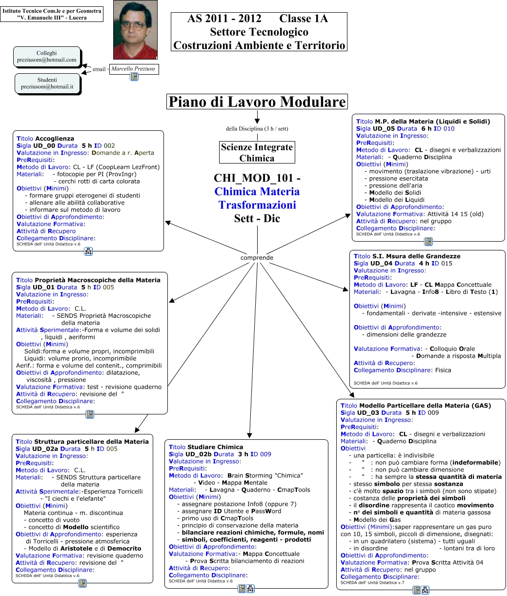Questa Cmap, creata con IHMC CmapTools, contiene informazioni relative a: CHI_MOD_101 Chimica Materia Trasformazioni, CHI_MOD_101 - Chimica Materia Trasformazioni Sett - Dic comprende Titolo Studiare Chimica Sigla UD_02b Durata 3 h ID 009 Valutazione in Ingresso: PreRequisiti: Metodo di Lavoro: Brain Storming "Chimica" - Video - Mappa Mentale Materiali: - Lavagna - Quaderno - CmapTools Obiettivi (Minimi) - assegnare postazione Info8 (oppure 7) - assegnare ID Utente e PassWord - primo uso di CmapTools - principio di conservazione della materia - bilanciare reazioni chimiche, formule, nomi - simboli, coefficienti, reagenti - prodotti Obiettivi di Approfondimento: Valutazione Formativa:- Mappa Concettuale - Prova Scritta bilanciamento di reazioni Attività di Recupero: Collegamento Disciplinare: SCHEDA dell' Unità Didattica v.6, Piano di Lavoro Modulare della Disciplina (3 h / sett) Scienze Integrate Chimica, CHI_MOD_101 - Chimica Materia Trasformazioni Sett - Dic comprende Titolo Modello Particellare della Materia (GAS) Sigla UD_03 Durata 5 h ID 009 Valutazione in Ingresso: PreRequisiti: Metodo di Lavoro: CL - disegni e verbalizzazioni Materiali: - Quaderno Disciplina Obiettivi - una particella: è indivisibile - " : non può cambiare forma (indeformabile) - " : non può cambiare dimensione - " : ha sempre la stessa quantità di materia - stesso simbolo per stessa sostanza - c'è molto spazio tra i simboli (non sono stipate) - costanza delle proprietà dei simboli - il disordine rappresenta il caotico movimento - n° dei simboli e quantità di materia gassosa - Modello dei Gas Obiettivi (Minimi):saper rappresentare un gas puro con 10, 15 simboli, piccoli di dimensione, disegnati: - in un quadrilatero (sistema) - tutti uguali - in disordine - lontani tra di loro Obiettivi di Approfondimento: Valutazione Formativa: Prova Scritta Attività 04 Attività di Recupero: nel gruppo Collegamento Disciplinare: SCHEDA dell' Unità Didattica v.7, Marcello Preziuso email Studenti preziusom@hotmail.it, CHI_MOD_101 - Chimica Materia Trasformazioni Sett - Dic comprende Titolo Accoglienza Sigla UD_00 Durata 5 h ID 002 Valutazione in Ingresso: Domande a r. Aperta PreRequisiti: Metodo di Lavoro: CL - LF (CoopLearn LezFront) Materiali: - fotocopie per PI (ProvIngr) - cerchi rotti di carta colorata Obiettivi (Minimi) - formare gruppi eterogenei di studenti - allenare alle abilità collaborative - informare sul metodo di lavoro Obiettivi di Approfondimento: Valutazione Formativa: Attività di Recupero: Collegamento Disciplinare: SCHEDA dell' Unità Didattica v.6, CHI_MOD_101 - Chimica Materia Trasformazioni Sett - Dic comprende Titolo M.P. della Materia (Liquidi e Solidi) Sigla UD_05 Durata 6 h ID 010 Valutazione in Ingresso: PreRequisiti: Metodo di Lavoro: CL - disegni e verbalizzazioni Materiali: - Quaderno Disciplina Obiettivi (Minimi) - movimento (traslazione vibrazione) - urti - pressione esercitata - pressione dell'aria - Modello dei Solidi - Modello dei Liquidi Obiettivi di Approfondimento: Valutazione Formativa: Attività 14 15 (old) Attività di Recupero: nel gruppo Collegamento Disciplinare: SCHEDA dell' Unità Didattica v.6, CHI_MOD_101 - Chimica Materia Trasformazioni Sett - Dic comprende Titolo Proprietà Macroscopiche della Materia Sigla UD_01 Durata 5 h ID 005 Valutazione in Ingresso: PreRequisiti: Metodo di Lavoro: C.L. Materiali: - SENDS Proprietà Macroscopiche della materia Attività Sperimentale:-Forma e volume dei solidi , liquidi , aeriformi Obiettivi (Minimi) Solidi:forma e volume propri, incomprimibili Liquidi: volume prorio, incomprimibile Aerif.: forma e volume del contenit., comprimibili Obiettivi di Approfondimento: dilatazione, viscosità , pressione Valutazione Formativa: test - revisione quaderno Attività di Recupero: revisione del " Collegamento Disciplinare: SCHEDA dell' Unità Didattica v.6, CHI_MOD_101 - Chimica Materia Trasformazioni Sett - Dic comprende Titolo S.I. Msura delle Grandezze Sigla UD_04 Durata 4 h ID 015 Valutazione in Ingresso: PreRequisiti: Metodo di Lavoro: LF - CL Mappa Concettuale Materiali: - Lavagna - Info8 - Libro di Testo (1) Obiettivi (Minimi) - fondamentali - derivate -intensive - estensive Obiettivi di Approfondimento: - dimensioni delle grandezze Valutazione Formativa: - Colloquio Orale - Domande a risposta Multipla Attività di Recupero: Collegamento Disciplinare: Fisica SCHEDA dell' Unità Didattica v.6, Marcello Preziuso email Colleghi preziusom@hotmail.com, CHI_MOD_101 - Chimica Materia Trasformazioni Sett - Dic comprende Titolo Struttura particellare della Materia Sigla UD_02a Durata 5 h ID 005 Valutazione in Ingresso: PreRequisiti: Metodo di Lavoro: C.L. Materiali: - SENDS Struttura particellare della materia Attività Sperimentale:-Esperienza Torricelli - "I ciechi e l'elefante" Obiettivi (Minimi) Materia continua - m. discontinua - concetto di vuoto - concetto di Modello scientifico Obiettivi di Approfondimento: esperienza di Torricelli - pressione atmosferica - Modello di Aristotele e di Democrito Valutazione Formativa: revisione quaderno Attività di Recupero: revisione del " Collegamento Disciplinare: SCHEDA dell' Unità Didattica v.6
