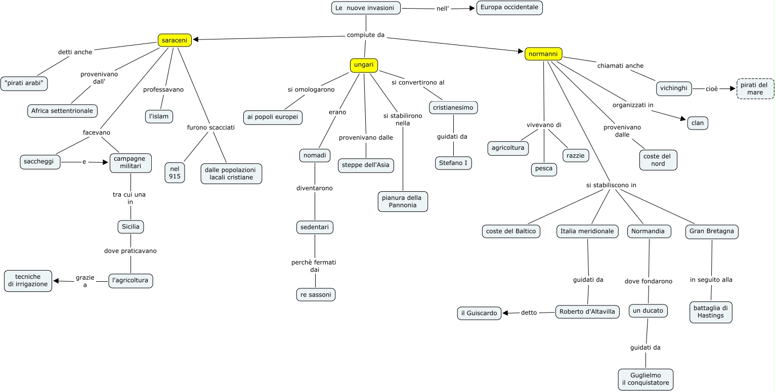 Questa Cmap, creata con IHMC CmapTools, contiene informazioni relative a: Le nuove invasioni barbariche, normanni vivevano di agricoltura, saraceni detti anche "pirati arabi", vichinghi cioè pirati del mare, normanni vivevano di razzie, saraceni facevano campagne militari, normanni provenivano dalle coste del nord, normanni si stabiliscono in Normandia, nomadi diventarono sedentari, ungari si stabilirono nella pianura della Pannonia, ungari si omologarono ai popoli europei, Gran Bretagna in seguito alla battaglia di Hastings, Roberto d'Altavilla detto il Guiscardo, Le nuove invasioni compiute da normanni, Le nuove invasioni compiute da saraceni, normanni si stabiliscono in Italia meridionale, l'agricoltura grazie a tecniche di irrigazione, saraceni furono scacciati nel 915, Le nuove invasioni nell' Europa occidentale, sedentari perchè fermati dai re sassoni, Italia meridionale guidati da Roberto d'Altavilla
