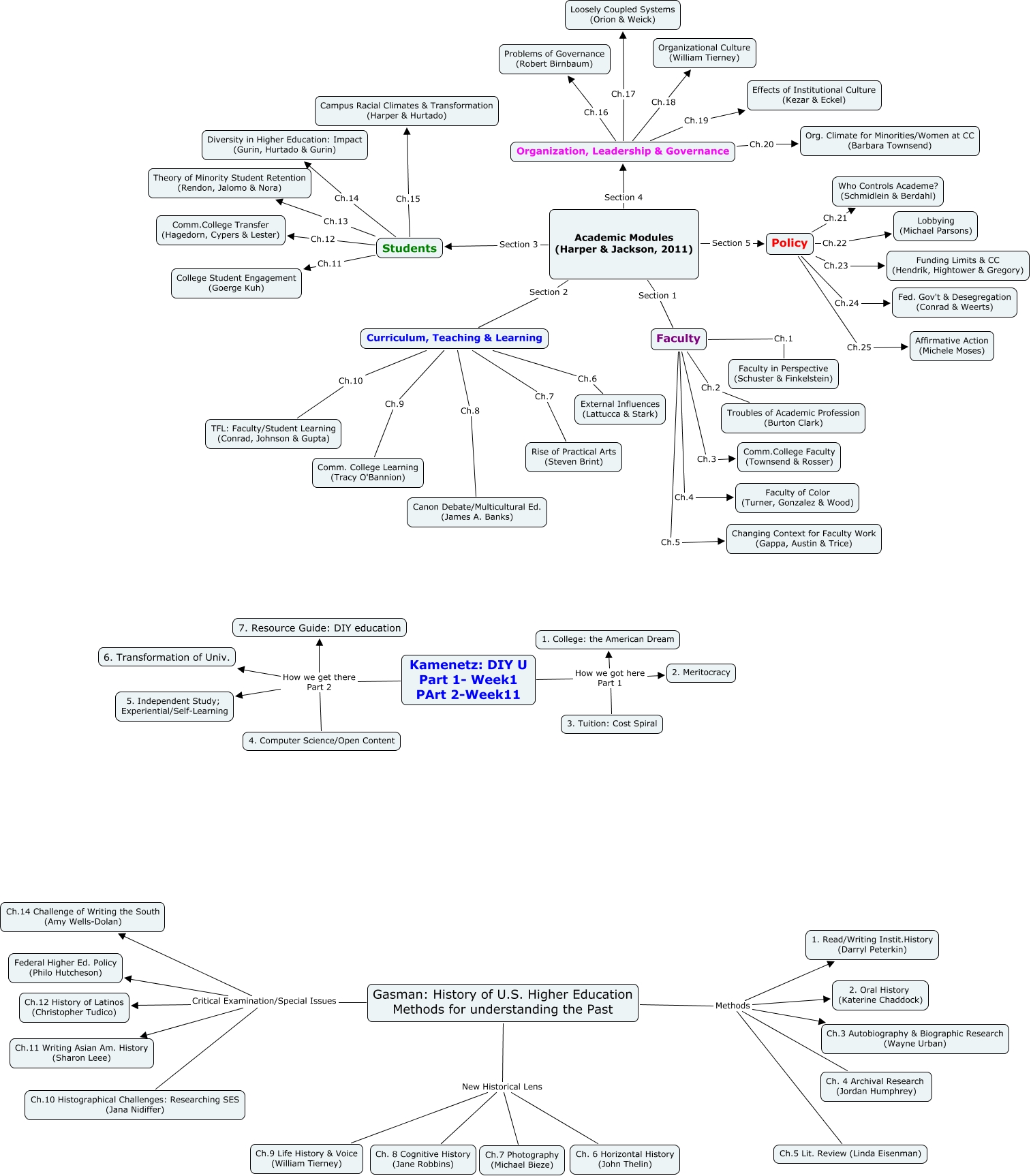 This Concept Map, created with IHMC CmapTools, has information related to: Outline of HED605 Texts, Policy Ch.21 Who Controls Academe? (Schmidlein & Berdahl), Kamenetz: DIY U Part 1- Week1 PArt 2-Week11 How we get there Part 2 5. Independent Study; Experiential/Self-Learning, Gasman: History of U.S. Higher Education Methods for understanding the Past Methods Ch.3 Autobiography & Biographic Research (Wayne Urban), Faculty Ch.2 Troubles of Academic Profession (Burton Clark), Gasman: History of U.S. Higher Education Methods for understanding the Past Methods Ch.5 Lit. Review (Linda Eisenman), Gasman: History of U.S. Higher Education Methods for understanding the Past Critical Examination/Special Issues Federal Higher Ed. Policy (Philo Hutcheson), Curriculum, Teaching & Learning Ch.10 TFL: Faculty/Student Learning (Conrad, Johnson & Gupta), Gasman: History of U.S. Higher Education Methods for understanding the Past New Historical Lens Ch.7 Photography (Michael Bieze), Faculty Ch.5 Changing Context for Faculty Work (Gappa, Austin & Trice), Policy Ch.25 Affirmative Action (Michele Moses), Organization, Leadership & Governance Ch.16 Problems of Governance (Robert Birnbaum), Academic Modules (Harper & Jackson, 2011) Section 2 Curriculum, Teaching & Learning, Academic Modules (Harper & Jackson, 2011) Section 3 Students, Organization, Leadership & Governance Ch.18 Organizational Culture (William Tierney), Gasman: History of U.S. Higher Education Methods for understanding the Past Methods 2. Oral History (Katerine Chaddock), Curriculum, Teaching & Learning Ch.9 Comm. College Learning (Tracy O'Bannion), Organization, Leadership & Governance Ch.19 Effects of Institutional Culture (Kezar & Eckel), Academic Modules (Harper & Jackson, 2011) Section 4 Organization, Leadership & Governance, Gasman: History of U.S. Higher Education Methods for understanding the Past New Historical Lens Ch.9 Life History & Voice (William Tierney), Gasman: History of U.S. Higher Education Methods for understanding the Past Critical Examination/Special Issues Ch.11 Writing Asian Am. History (Sharon Leee)