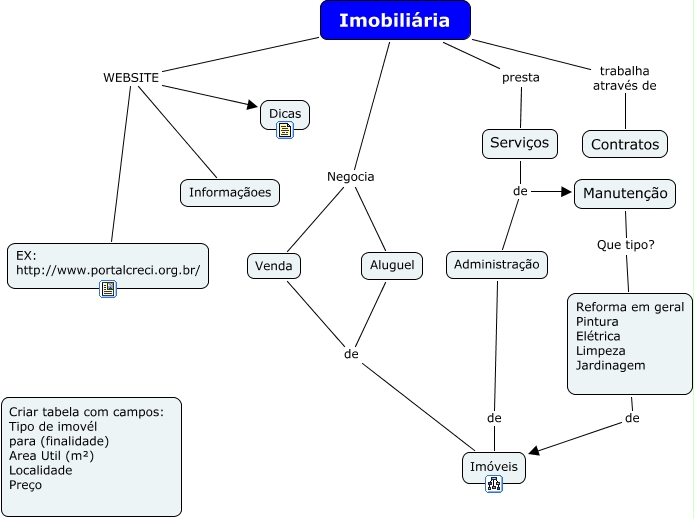 Esse mapa conceitual, produzido no IHMC CmapTools, tem a informação relacionada a: Imobiliaria, Venda de Imóveis, Imobiliária Negocia Aluguel, Imobiliária Negocia Venda, Imobiliária WEBSITE EX: http://www.portalcreci.org.br/, Imobiliária WEBSITE Dicas, Manutenção Que tipo? Reforma em geral Pintura Elétrica Limpeza Jardinagem, Imobiliária WEBSITE Informaçãoes, Serviços de Manutenção, Reforma em geral Pintura Elétrica Limpeza Jardinagem de Imóveis, Administração de Imóveis, Imobiliária presta Serviços, Imobiliária trabalha através de Contratos, Serviços de Administração, Aluguel de Imóveis
