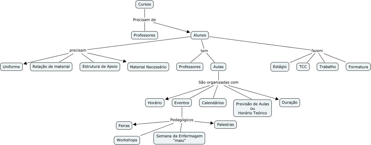 Esse mapa conceitual, produzido no IHMC CmapTools, tem a informação relacionada a: Cursos em Andamento, Alunos precisam Relação de material, Alunos precisam Uniforme, Eventos Pedagógicos Palestras, Alunos precisam Material Necessário, Cursos Precisam de Alunos, Cursos Precisam de Professores, Aulas São organizadas com Eventos, Eventos Pedagógicos Workshops, Alunos tem Aulas, Alunos fazem Trabalho, Alunos fazem TCC, Alunos fazem Formatura, Alunos fazem Estágio, Aulas São organizadas com Duração, Aulas São organizadas com Calendários, Alunos precisam Estrutura de Apoio, Aulas São organizadas com Previsão de Aulas ou Horário Teórico, Alunos tem Professores, Aulas São organizadas com Horário, Eventos Pedagógicos Semana da Enfermagem "maio"