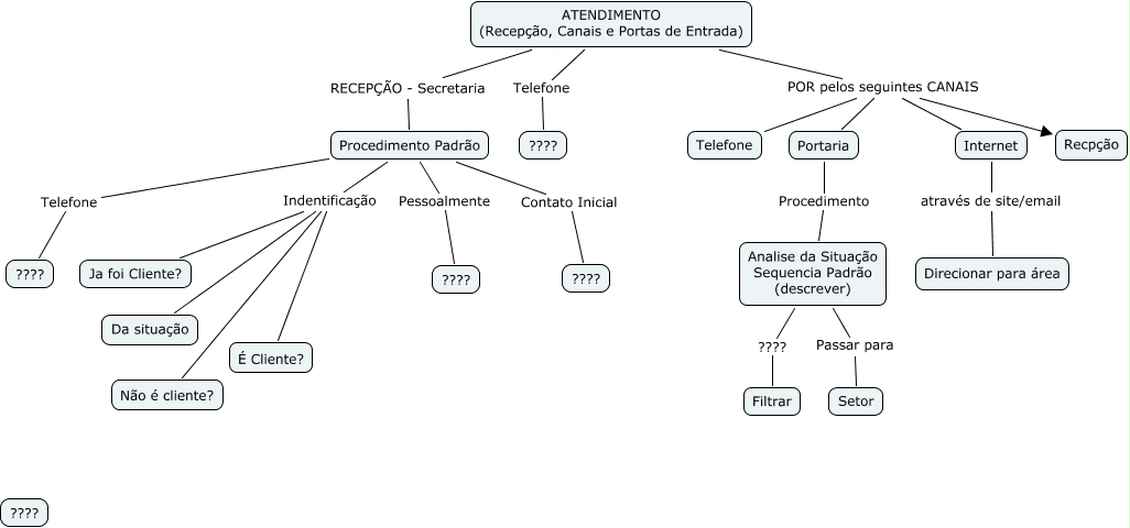 Esse mapa conceitual, produzido no IHMC CmapTools, tem a informação relacionada a: Atendimento, Portaria Procedimento Analise da Situação Sequencia Padrão (descrever), ATENDIMENTO (Recepção, Canais e Portas de Entrada) POR pelos seguintes CANAIS Recpção, ATENDIMENTO (Recepção, Canais e Portas de Entrada) POR pelos seguintes CANAIS Telefone, Internet através de site/email Direcionar para área, ATENDIMENTO (Recepção, Canais e Portas de Entrada) POR pelos seguintes CANAIS Portaria, Procedimento Padrão Indentificação Não é cliente?, Procedimento Padrão Contato Inicial ????, Analise da Situação Sequencia Padrão (descrever) Passar para Setor, ATENDIMENTO (Recepção, Canais e Portas de Entrada) Telefone ????, ATENDIMENTO (Recepção, Canais e Portas de Entrada) RECEPÇÃO - Secretaria Procedimento Padrão, ATENDIMENTO (Recepção, Canais e Portas de Entrada) POR pelos seguintes CANAIS Internet, Procedimento Padrão Indentificação É Cliente?, Procedimento Padrão Telefone ????, Procedimento Padrão Pessoalmente ????, Analise da Situação Sequencia Padrão (descrever) ???? Filtrar, Procedimento Padrão Indentificação Ja foi Cliente?, Procedimento Padrão Indentificação Da situação