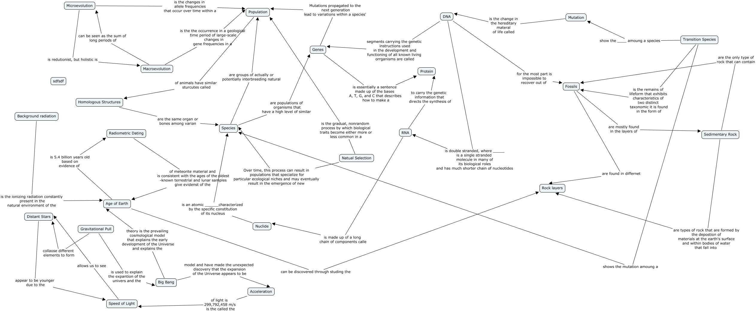 This Concept Map, created with IHMC CmapTools, has information related to: Ybema-Evolution, Radiometric Dating of meteorite material and is consistent with the ages of the oldest -known terrestrial and lunar samples give evidenst of the Age of Earth, Sedimentary Rock are the only type of rock that can contain Fossils, Microevolution is redutionist, but holistic is Macroevolution, Transition Species shows the mutation amoung a Species, Transition Species show the ____ amoung a species Mutation, Transition Species is the remains of lifeform that exhibits characteristics of two distinct taxonomic it is found in the form of Fossils, Species are populations of organisms that have a high level of similar Genes, Nuclide is an atomic ______characterized by the specific constitution of its nucleus Species, Fossils are found in differnet Rock layers, Gravitational Pull collaose different elements to form Distant Stars, Age of Earth is 5.4 billion years old based on evidence of Radiometric Dating, Acceleration of light is 299,792,458 m/s is the called the Speed of Light, Big Bang theory is the prevailing cosmological model that explains the early development of the Universe and explains the Age of Earth, Genes is essentially a sentence made up of the bases A, T, G, and C that describes how to make a Protein, Natual Selection Over time, this process can result in populations that specialize for particular ecological niches and may eventually result in the emergence of new Species, Homologous Structures are the same organ or bones among varian Species, RNA is made up of a long chain of components calle Nuclide, Microevolution is the changes in allele frequencies that occur over time within a Population, Age of Earth can be discovered through studing the Rock layers, Natual Selection is the gradual, nonrandom process by which biological traits become either more or less common in a Population