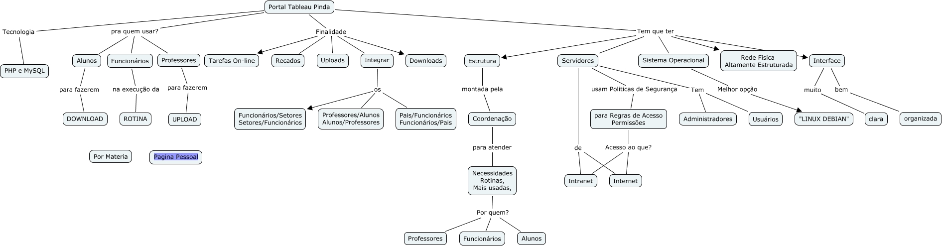 Esse mapa conceitual, produzido no IHMC CmapTools, tem a informação relacionada a: Intranet e Extranet, Portal Tableau Pinda Finalidade Tarefas On-line, Portal Tableau Pinda Tem que ter Servidores, Necessidades Rotinas, Mais usadas, Por quem? Alunos, Professores para fazerem UPLOAD, Portal Tableau Pinda Tem que ter Rede Física Altamente Estruturada, Portal Tableau Pinda Tem que ter Estrutura, Estrutura montada pela Coordenação, Integrar os Pais/Funcionários Funcionários/Pais, Portal Tableau Pinda Finalidade Uploads, Portal Tableau Pinda Tem que ter Interface, Portal Tableau Pinda pra quem usar? Alunos, Servidores usam Politicas de Segurança para Regras de Acesso Permissões, para Regras de Acesso Permissões Acesso ao que? Internet, Funcionários na execução da ROTINA, Servidores Tem Usuários, Necessidades Rotinas, Mais usadas, Por quem? Funcionários, Servidores de Internet, Portal Tableau Pinda Finalidade Recados, Portal Tableau Pinda Finalidade Integrar, Interface muito clara