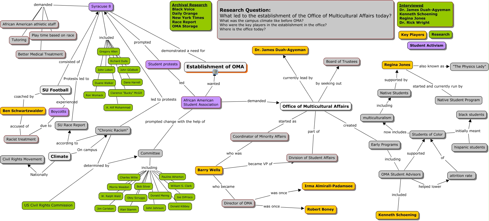 This Concept Map, created with IHMC CmapTools, has information related to: Group CMAP, Barry Wells who became Director of OMA, Syracuse 8 included John GOdbolt, Committee including Otey Scruggs, OMA Student Advisors helped lower attrition rate, Syracuse 8 demanded African American athletic staff, OMA Student Advisors supported Students of Color, SU Football experienced Boycotts, African American Student Association wanted Establishment of OMA, Students of Color initially meant black students, Syracuse 8 included John Lobon, Syracuse 8 demanded Play time based on race, Committee including Joe DiPrisco, Committee including Jim Carleton, multiculturalism including Native Students, Office of Multicultural Affairs by seeking out Board of Trustees, Students of Color now includes multiculturalism, "Chronic Racism" determined by Committee, Office of Multicultural Affairs started as Coordinator of Minority Affairs, attrition rate of Students of Color, Native Students supported by Regina Jones