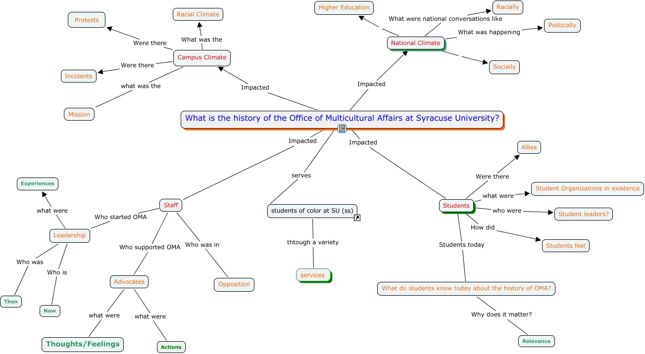 This Concept Map, created with IHMC CmapTools, has information related to: Group cmap2, Advocates what were Thoughts/Feelings, Campus Climate What was the Racial Climate, Staff Who was in Opposition, Students who were Student leaders?, What is the history of the Office of Multicultural Affairs at Syracuse University? Impacted Staff, Staff Who started OMA Leadership, What do students know today about the history of OMA? Why does it matter? Relevance, Campus Climate Were there Incidents, What is the history of the Office of Multicultural Affairs at Syracuse University? Impacted Students, students of color at SU (ss) thtough a variety services, Campus Climate what was the Mission, Students Students today What do students know today about the history of OMA?, Campus Climate Were there Protests, Staff Who supported OMA Advocates, Students Were there Allies, National Climate What was happening Politically, Leadership what were Experiences, What is the history of the Office of Multicultural Affairs at Syracuse University? Impacted Campus Climate, What is the history of the Office of Multicultural Affairs at Syracuse University? serves students of color at SU (ss), National Climate What were national conversations like Racially