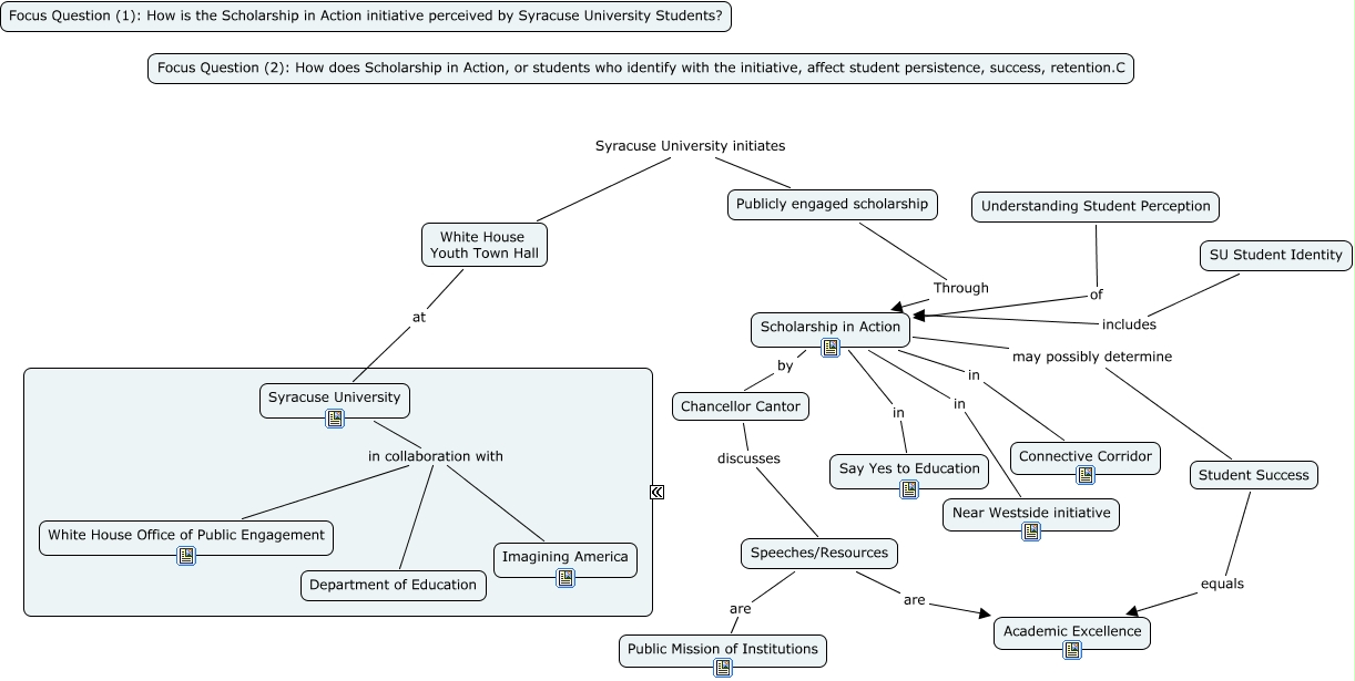 This Concept Map, created with IHMC CmapTools, has information related to: Youth Town Hall-Scholarship in Action, White House Youth Town Hall at Syracuse University, Understanding Student Perception of Scholarship in Action, Syracuse University in collaboration with Department of Education, Speeches/Resources are Academic Excellence, Publicly engaged scholarship Through Scholarship in Action, Chancellor Cantor discusses Speeches/Resources, Scholarship in Action in Connective Corridor, White House Youth Town Hall Syracuse University initiates Publicly engaged scholarship, Syracuse University in collaboration with White House Office of Public Engagement, Scholarship in Action in Say Yes to Education, Scholarship in Action may possibly determine Student Success, Speeches/Resources are Public Mission of Institutions, Scholarship in Action in Near Westside initiative, Student Success equals Academic Excellence, SU Student Identity includes Scholarship in Action, Scholarship in Action by Chancellor Cantor, Syracuse University in collaboration with Imagining America