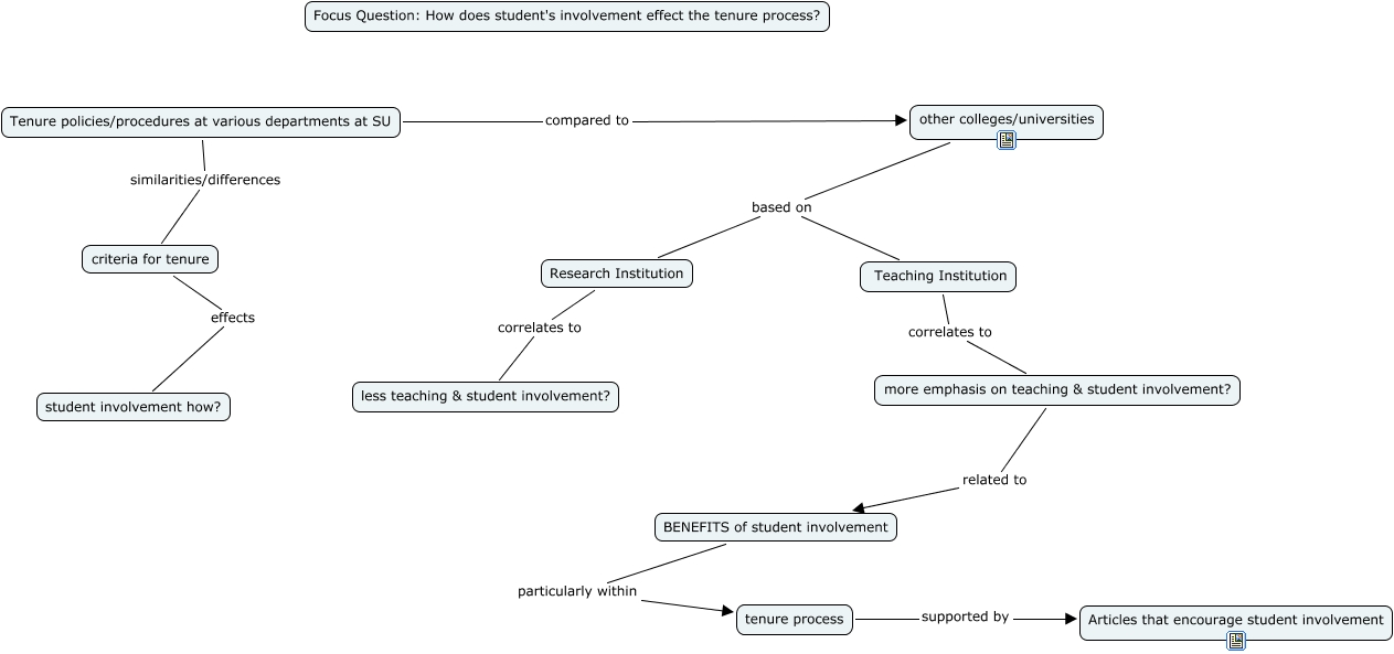 This Concept Map, created with IHMC CmapTools, has information related to: Dana's CMAP, other colleges/universities based on Research Institution, Tenure policies/procedures at various departments at SU similarities/differences criteria for tenure, more emphasis on teaching & student involvement? related to BENEFITS of student involvement, Teaching Institution correlates to more emphasis on teaching & student involvement?, Tenure policies/procedures at various departments at SU compared to other colleges/universities, tenure process supported by Articles that encourage student involvement, Teaching Institution based on Research Institution, criteria for tenure effects student involvement how?, Research Institution correlates to less teaching & student involvement?, BENEFITS of student involvement particularly within tenure process