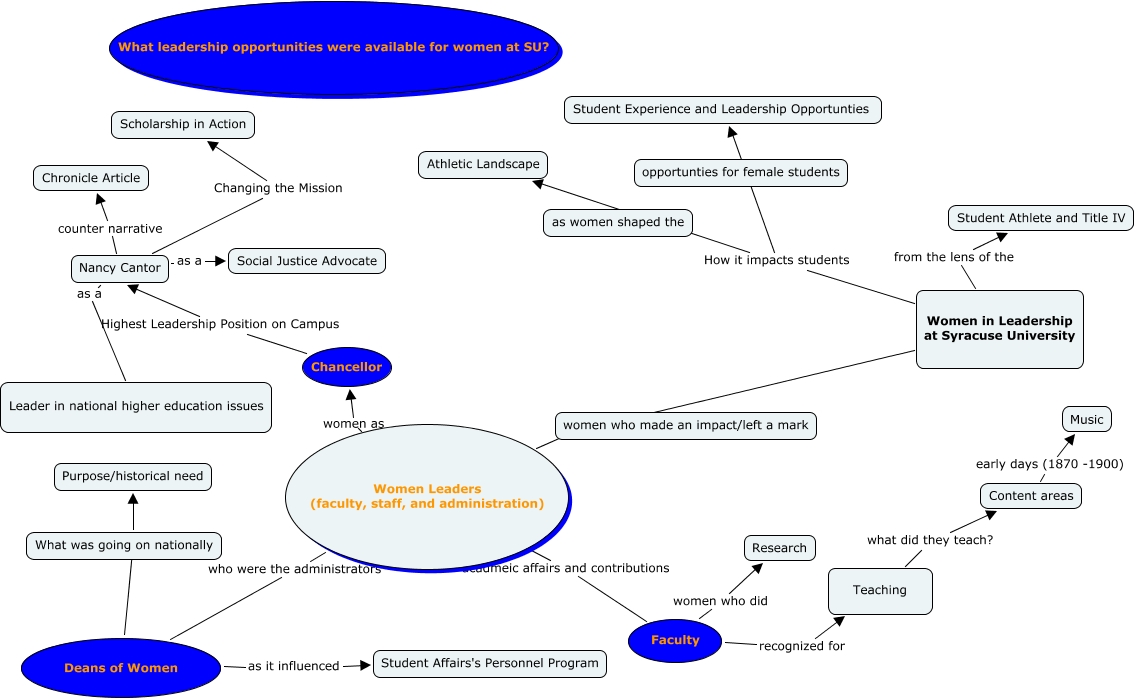 This Concept Map, created with IHMC CmapTools, has information related to: MMurphy_1, Faculty women who did Research, Faculty recognized for Teaching, Nancy Cantor counter narrative Chronicle Article, Women in Leadership at Syracuse University Women Leaders (faculty, staff, and administration), Teaching what did they teach? Content areas, Nancy Cantor Changing the Mission Scholarship in Action, Chancellor Highest Leadership Position on Campus Nancy Cantor, Women Leaders (faculty, staff, and administration) acadmeic affairs and contributions Faculty, Deans of Women as it influenced Student Affairs's Personnel Program, Content areas early days (1870 -1900) Music, Nancy Cantor as a Social Justice Advocate, Nancy Cantor as a Leader in national higher education issues, Women in Leadership at Syracuse University How it impacts students Athletic Landscape, Deans of Women Purpose/historical need, Women in Leadership at Syracuse University from the lens of the Student Athlete and Title IV, Women in Leadership at Syracuse University How it impacts students Student Experience and Leadership Opportunties, Women Leaders (faculty, staff, and administration) who were the administrators Deans of Women, Women Leaders (faculty, staff, and administration) women as Chancellor