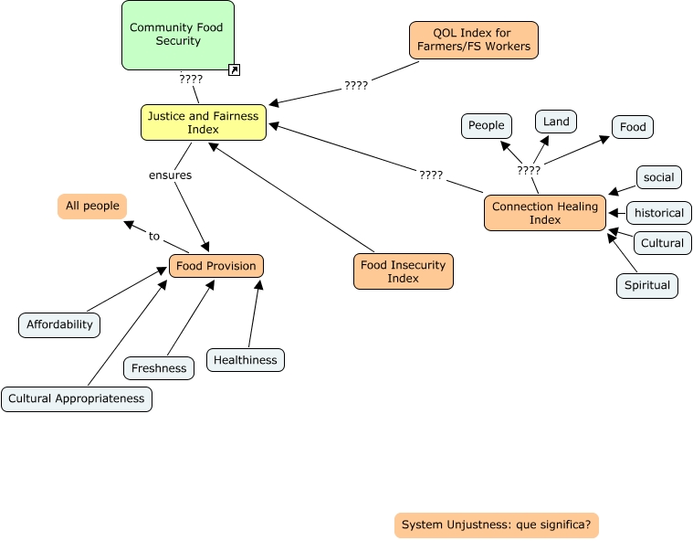 This Concept Map, created with IHMC CmapTools, has information related to: Justice Index, Connection Healing Index ???? Justice and Fairness Index, Justice and Fairness Index ensures Food Provision, Connection Healing Index ???? People, Spiritual Connection Healing Index, Cultural Appropriateness Food Provision, Affordability Food Provision, historical Connection Healing Index, Freshness Food Provision, Food Insecurity Index Justice and Fairness Index, Cultural Connection Healing Index, Food Provision to All people, QOL Index for Farmers/FS Workers ???? Justice and Fairness Index, Justice and Fairness Index ???? Community Food Security, Healthiness Food Provision, Connection Healing Index ???? Land, Connection Healing Index ???? Food, social Connection Healing Index