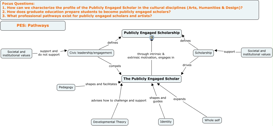 This Concept Map, created with IHMC CmapTools, has information related to: TimW PES CMAP draft 1, Whole self expands The Publicly Engaged Scholar, Societal and institutional values support and do not support Civic leadership/engagement, Civic leadership/engagement compels The Publicly Engaged Scholar, Pedagogy shapes and facilitates The Publicly Engaged Scholar, Identity shapes and guides The Publicly Engaged Scholar, Civic leadership/engagement defines Publicly Engaged Scholarship, The Publicly Engaged Scholar through intrinsic & extrinsic motivation, engages in Publicly Engaged Scholarship, Developmental Theory advises how to challenge and support The Publicly Engaged Scholar, Societal and institutional values support Scholarship, Scholarship drives The Publicly Engaged Scholar, Scholarship defines Publicly Engaged Scholarship