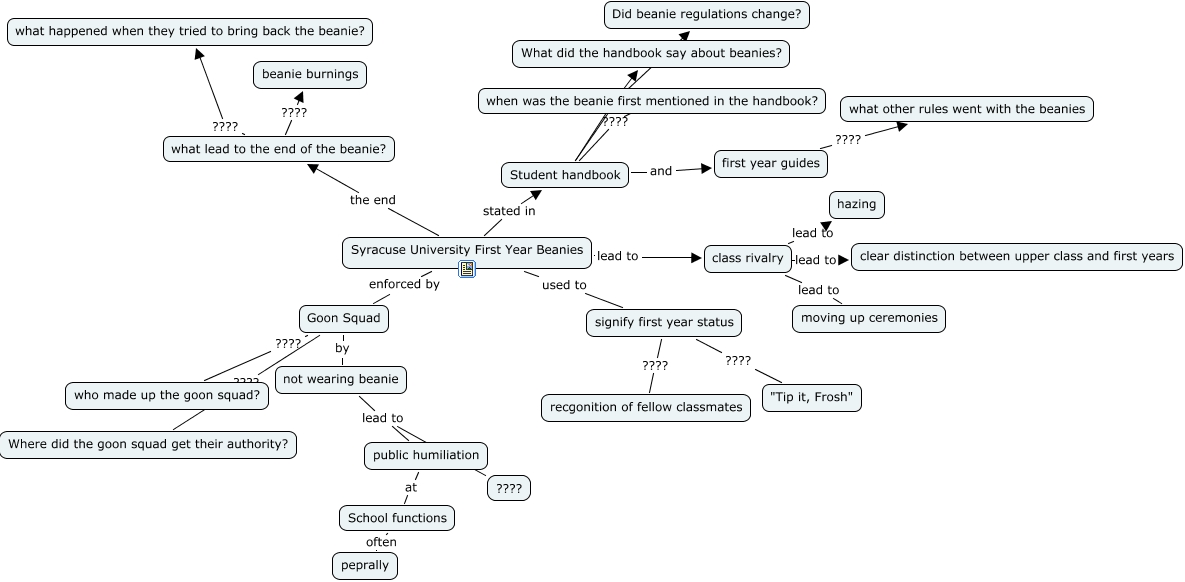 This Concept Map, created with IHMC CmapTools, has information related to: research project, Syracuse University First Year Beanies used to signify first year status, first year guides ???? what other rules went with the beanies, Student handbook ???? What did the handbook say about beanies?, Student handbook and first year guides, not wearing beanie lead to ????, Goon Squad ???? who made up the goon squad?, class rivalry lead to clear distinction between upper class and first years, Syracuse University First Year Beanies enforced by Goon Squad, class rivalry lead to moving up ceremonies, Syracuse University First Year Beanies the end what lead to the end of the beanie?, Student handbook ???? Did beanie regulations change?, signify first year status ???? "Tip it, Frosh", School functions often peprally, not wearing beanie lead to public humiliation, what lead to the end of the beanie? ???? what happened when they tried to bring back the beanie?, Syracuse University First Year Beanies stated in Student handbook, public humiliation at School functions, Goon Squad by not wearing beanie, Student handbook ???? when was the beanie first mentioned in the handbook?, Syracuse University First Year Beanies lead to class rivalry