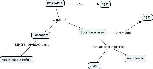 Esse mapa conceitual, produzido no IHMC CmapTools, tem a informação relacionada a: Portaria, Local de acesso para acessar é preciso Aviso, Passagem LIMITE, DIVISÃO entre Via Pública X Prédio, PORTARIA O que é? Passagem, Local de acesso Controlado ????, PORTARIA O que é? Local de acesso, Local de acesso para acessar é preciso Autorização, PORTARIA ???? ????