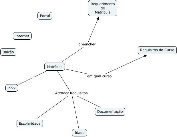 Esse mapa conceitual, produzido no IHMC CmapTools, tem a informação relacionada a: Matrícula, Matrícula Atender Requisitos Escolaridade, Matrícula preencher Requerimento de Matrícula, Matrícula Atender Requisitos Idade, Matrícula ????, Matrícula em qual curso Requisitos do Curso, Matrícula Atender Requisitos Documentação