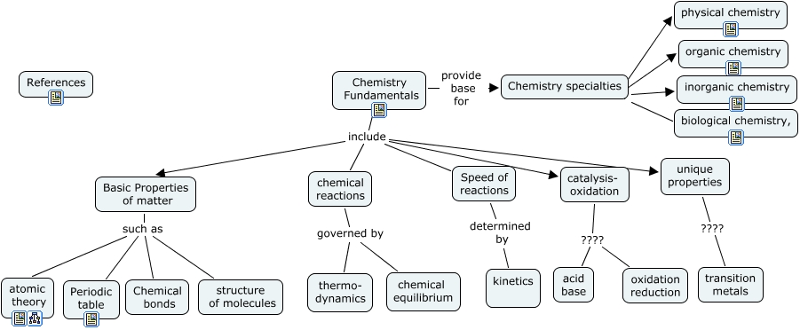 Este Cmap, tiene información relacionada con: Fundamentals of Chemistry, Chemistry specialties ???? biological chemistry,, Chemistry specialties ???? physical chemistry, Basic Properties of matter such as Periodic table, Chemistry Fundamentals include catalysis- oxidation, Chemistry Fundamentals include Basic Properties of matter, Chemistry Fundamentals include Speed of reactions, catalysis- oxidation ???? acid base, Chemistry specialties ???? inorganic chemistry, Speed of reactions determined by kinetics, Basic Properties of matter such as structure of molecules, Chemistry Fundamentals include unique properties, catalysis- oxidation ???? oxidation reduction, chemical reactions governed by thermo- dynamics, chemical reactions governed by chemical equilibrium, unique properties ???? transition metals, Basic Properties of matter such as atomic theory, Chemistry Fundamentals include chemical reactions, Chemistry Fundamentals provide base for Chemistry specialties, Basic Properties of matter such as Chemical bonds, Chemistry specialties ???? organic chemistry