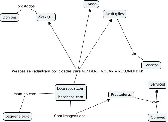 Esse mapa conceitual, produzido no IHMC CmapTools, tem a informação relacionada a: boca a boca, bocaaboca.com bocaboca.com Com imagens dos Prestadores, Serviços prestados Opniões, bocaaboca.com bocaboca.com Pessoas se cadastram por cidades para VENDER, TROCAR e RECOMENDAR Avaliações, Prestadores com Opniões, bocaaboca.com bocaboca.com Pessoas se cadastram por cidades para VENDER, TROCAR e RECOMENDAR Coisas, Prestadores com Serviços, Avaliações de Serviços, bocaaboca.com bocaboca.com Pessoas se cadastram por cidades para VENDER, TROCAR e RECOMENDAR Serviços, bocaaboca.com bocaboca.com mantido com pequena taxa