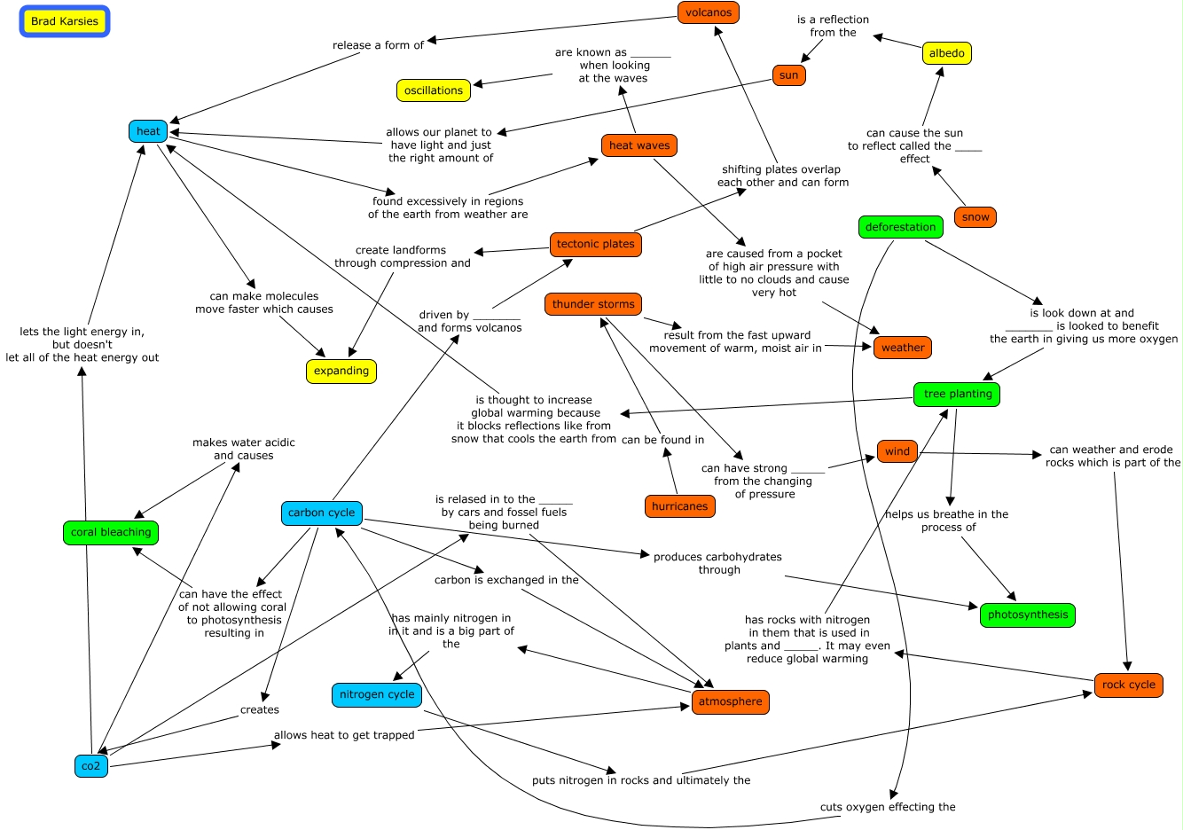 This Concept Map, created with IHMC CmapTools, has information related to: Karsies_Cycles_Global_Warming, heat waves are known as ______ when looking at the waves oscillations, hurricanes can be found in thunder storms, carbon cycle can have the effect of not allowing coral to photosynthesis resulting in coral bleaching, co2 allows heat to get trapped atmosphere, deforestation is look down at and _______ is looked to benefit the earth in giving us more oxygen tree planting, heat found excessively in regions of the earth from weather are heat waves, co2 lets the light energy in, but doesn't let all of the heat energy out heat, tree planting is thought to increase global warming because it blocks reflections like from snow that cools the earth from heat, sun allows our planet to have light and just the right amount of heat, atmosphere has mainly nitrogen in in it and is a big part of the nitrogen cycle, deforestation cuts oxygen effecting the carbon cycle, thunder storms can have strong _____ from the changing of pressure wind, tectonic plates shifting plates overlap each other and can form volcanos, co2 makes water acidic and causes coral bleaching, heat can make molecules move faster which causes expanding, carbon cycle driven by _______ and forms volcanos tectonic plates, tree planting helps us breathe in the process of photosynthesis, carbon cycle creates co2, thunder storms result from the fast upward movement of warm, moist air in weather, carbon cycle carbon is exchanged in the atmosphere