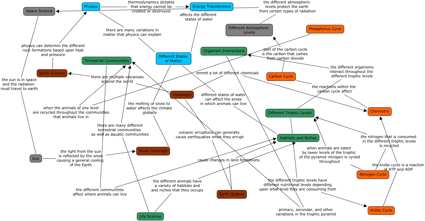 This Concept Map, created with IHMC CmapTools, has information related to: Ecology Hans VanVeen, Different Trophic Levels the different trophic levels have different nutritional levels depending upon what level they are consuming from Krebs Cycle, Carbon Cycle the reactions within the carbon cycle affect Chemistry, Energy Transference affects the different states of water Different States of Matter, Volcanoes volcanic erruptions can generally cause earthquakes when they errupt Earth Quakes, Volcanoes emmit a lot of different chemicals Chemistry, Life Science there are many different terrestrial communities as well as aquatic communities Terrestrial Communities, Earth Science physics can determin the different rock formations based upon heat and pressure Physics, Life Science the different animals have a variety of habitats and and niches that they occupy Habitats and Niches, Volcanoes there are multiple volcanoes around the world Earth Science, Organism Interactions primary, secondar, and other variations in the trophic pyramid Terrestrial Communities, Nitrogen Cycle the nitrogen that is consumed in the different trophic levels is recycled Different Trophic Levels, Sun the light from the sun is reflected by the snow causing a general cooling of the Earth Snow Coverage, Different Trophic Levels the different organisms interact throughout the different trophic levels Organism Interactions, Physics thermodynamics dictates that energy cannot be created or destroyed Energy Transference, Terrestrial Communities the different communities affect where animals can live Habitats and Niches, Phosphorus Cycle when the animals of one level are recycled throughout the communities that animals live in Terrestrial Communities, Different States of Matter different states of water can affect the areas in which animals can live Habitats and Niches, Nitrogen Cycle when animals are eaten by lower levels of the trophic of the pyramid nitrogen is cycled throughout Different Trophic Levels, Carbon Cycle part of the carbon cycle is the carbon that comes from carbon dioxide Different Atmospheric Levels, Krebs Cycle the krebs cycle is a reaction of ATP and ADP Chemistry