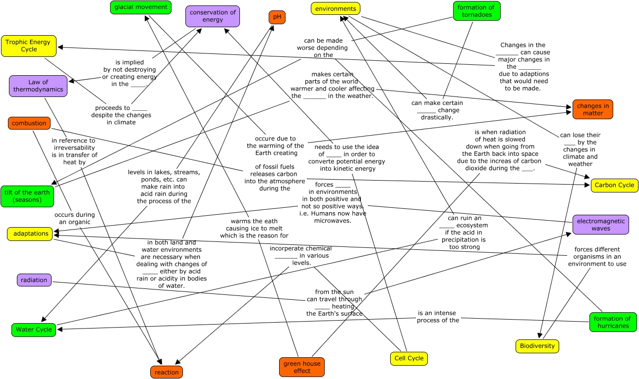 This Concept Map, created with IHMC CmapTools, has information related to: Kathy Butt- cycles, formation of hurricanes is an intense process of the Water Cycle, Water Cycle can ruin an ____ ecosystem if the acid in precipitation is too strong environments, environments can lose their ___ by the changes in climate and weather Biodiversity, formation of tornadoes can be made worse depending on the tilt of the earth (seasons), Law of thermodynamics in reference to irreversability is in transfer of heat by reaction, radiation from the sun can travel through ____ heating the Earth's surface electromagnetic waves, formation of tornadoes can make certain _____ change drastically. environments, combustion of fossil fuels releases carbon into the atmosphere during the Carbon Cycle, green house effect is when radiation of heat is slowed down when going from the Earth back into space due to the increas of carbon dioxide during the ___. Carbon Cycle, Cell Cycle needs to use the idea of ____ in order to converte potential energy into kinetic energy conservation of energy, electromagnetic waves forces ____ in environments in both positive and not so positive ways. i.e. Humans now have microwaves. adaptations, formation of hurricanes can be made worse depending on the tilt of the earth (seasons), pH levels in lakes, streams, ponds, etc. can make rain into acid rain during the process of the Water Cycle, glacial movement occure due to the warming of the Earth creating changes in matter, conservation of energy is implied by not destroying or creating energy in the ____. Law of thermodynamics, green house effect warms the eath causing ice to melt which is the reason for glacial movement, environments Changes in the ______ can cause major changes in the ______ due to adaptions that would need to be made. Trophic Energy Cycle, Cell Cycle incorperate chemical ______ in various levels. reaction, Trophic Energy Cycle proceeds to ____ despite the changes in climate conservation of energy, adaptations in both land and water environments are necessary when dealing with changes of ____ either by acid rain or acidity in bodies of water. pH