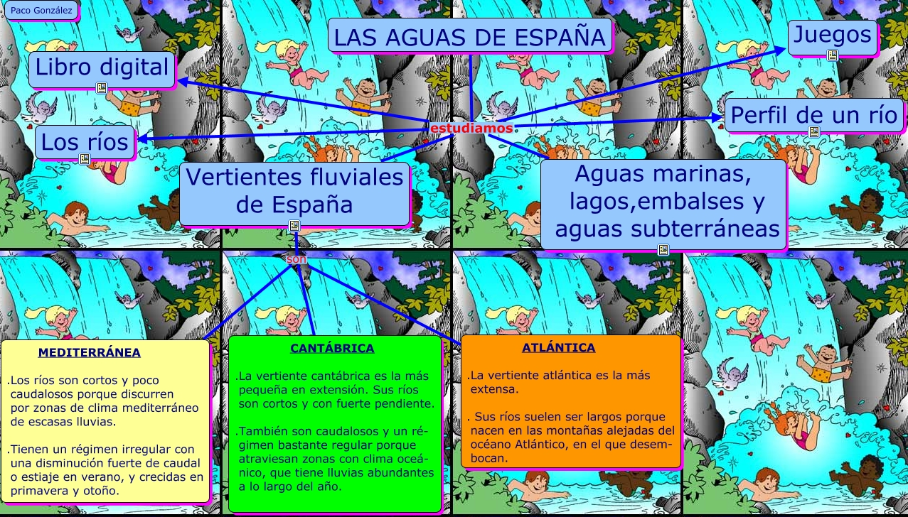 Este Cmap, tiene información relacionada con: Las aguas de España, LAS AGUAS DE ESPAÑA estudiamos Los ríos, LAS AGUAS DE ESPAÑA estudiamos Libro digital, LAS AGUAS DE ESPAÑA estudiamos Vertientes fluviales de España, LAS AGUAS DE ESPAÑA estudiamos Perfil de un río, Vertientes fluviales de España son ATLÁNTICA .La vertiente atlántica es la más extensa. . Sus ríos suelen ser largos porque nacen en las montañas alejadas del océano Atlántico, en el que desem- bocan., LAS AGUAS DE ESPAÑA estudiamos Juegos, LAS AGUAS DE ESPAÑA estudiamos Aguas marinas, lagos,embalses y aguas subterráneas, Vertientes fluviales de España son CANTÁBRICA .La vertiente cantábrica es la más pequeña en extensión. Sus ríos son cortos y con fuerte pendiente. .También son caudalosos y un ré- gimen bastante regular porque atraviesan zonas con clima oceá- nico, que tiene lluvias abundantes a lo largo del año., Vertientes fluviales de España son MEDITERRÁNEA .Los ríos son cortos y poco caudalosos porque discurren por zonas de clima mediterráneo de escasas lluvias. .Tienen un régimen irregular con una disminución fuerte de caudal o estiaje en verano, y crecidas en primavera y otoño.