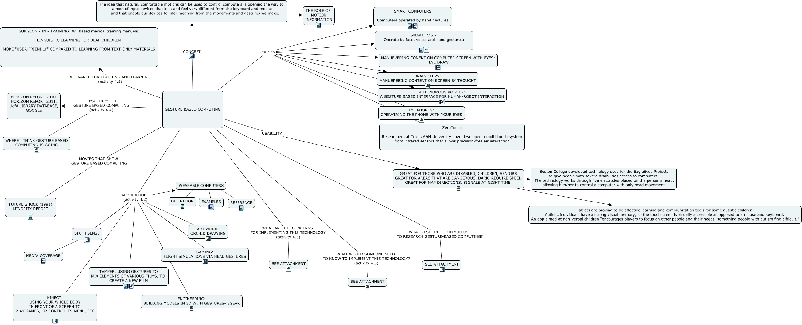 This Concept Map, created with IHMC CmapTools, has information related to: BMH - GESTURE BASED COMPUTING, GESTURE BASED COMPUTING DEVISES BRAIN CHIPS: MANUERERING CONTENT ON SCREEN BY THOUGHT, SIXTH SENSE ???? MEDIA COVERAGE, WEARABLE COMPUTERS ???? EXAMPLES, GESTURE BASED COMPUTING APPLICATIONS (activity 4.2) SIXTH SENSE, GESTURE BASED COMPUTING RELEVANCE FOR TEACHING AND LEARNING (activity 4.5) SURGEON - IN - TRAINING: Wii based medical training manuels. LINGUISTIC LEARNING FOR DEAF CHILDREN MORE "USER-FRIENDLY" COMPARED TO LEARNING FROM TEXT-ONLY MATERIALS, GESTURE BASED COMPUTING WHAT WOULD SOMEONE NEED TO KNOW TO IMPLEMENT THIS TECHNOLOGY? (activity 4.6) SEE ATTACHMENT, GESTURE BASED COMPUTING DEVISES ZeroTouch Researchers at Texas A&M University have developed a multi-touch system from infrared sensors that allows precision-free air interaction., GREAT FOR THOSE WHO ARE DISABLED, CHILDREN, SENIORS GREAT FOR AREAS THAT ARE DANGEROUS, DARK, REQUIRE SPEED GREAT FOR MAP DIRECTIONS, SIGNALS AT NIGHT TIME. ???? ????, GESTURE BASED COMPUTING RESOURCES ON GESTURE BASED COMPUTING (activity 4.4) HORIZON REPORT 2010, HORIZON REPORT 2011, UofA LIBRARY DATABASE, GOOGLE, GESTURE BASED COMPUTING USABILITY GREAT FOR THOSE WHO ARE DISABLED, CHILDREN, SENIORS GREAT FOR AREAS THAT ARE DANGEROUS, DARK, REQUIRE SPEED GREAT FOR MAP DIRECTIONS, SIGNALS AT NIGHT TIME., The idea that natural, comfortable motions can be used to control computers is opening the way to a host of input devices that look and feel very different from the keyboard and mouse — and that enable our devices to infer meaning from the movements and gestures we make. ???? THE ROLE OF MOTION INFORMATION, GREAT FOR THOSE WHO ARE DISABLED, CHILDREN, SENIORS GREAT FOR AREAS THAT ARE DANGEROUS, DARK, REQUIRE SPEED GREAT FOR MAP DIRECTIONS, SIGNALS AT NIGHT TIME. ???? Tablets are proving to be effective learning and communication tools for some autistic children. Autistic individuals have a strong visual memory, so the touchscreen is visually accessible as opposed to a mouse and keyboard. An app aimed at non-verbal children “encourages players to focus on other people and their needs, something people with autism find difficult.”, GESTURE BASED COMPUTING MOVIES THAT SHOW GESTURE BASED COMPUTING FUTURE SHOCK (1991) MINORITY REPORT, GESTURE BASED COMPUTING CONCEPT The idea that natural, comfortable motions can be used to control computers is opening the way to a host of input devices that look and feel very different from the keyboard and mouse — and that enable our devices to infer meaning from the movements and gestures we make., GESTURE BASED COMPUTING DEVISES MANUEVERING CONENT ON COMPUTER SCREEN WITH EYES: EYE DRAW, WEARABLE COMPUTERS ???? REFERENCE, GESTURE BASED COMPUTING DEVISES SMART TV'S - Operate by face, voice, and hand gestures:, GESTURE BASED COMPUTING APPLICATIONS (activity 4.2) ART WORK: ORCHID DRAWING, GESTURE BASED COMPUTING DEVISES AUTONOMOUS ROBOTS: A GESTURE BASED INTERFACE FOR HUMAN-ROBOT INTERACTION, GESTURE BASED COMPUTING WHAT ARE THE CONCERNS FOR IMPLEMENTING THIS TECHNOLOGY (activity 4.3) SEE ATTACHMENT