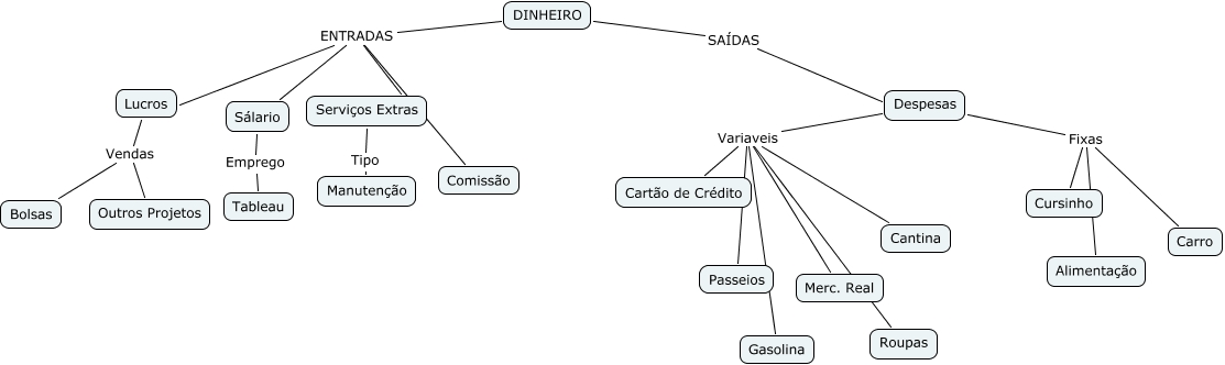 Esse mapa conceitual, produzido no IHMC CmapTools, tem a informação relacionada a: Dinheiro, DINHEIRO ENTRADAS Comissão, Despesas Variaveis Gasolina, Despesas Variaveis Cantina, Despesas Variaveis Roupas, Sálario Emprego Tableau, Despesas Variaveis Cartão de Crédito, Lucros Vendas Bolsas, DINHEIRO ENTRADAS Lucros, DINHEIRO ENTRADAS Serviços Extras, DINHEIRO SAÍDAS Despesas, Despesas Fixas Alimentação, DINHEIRO ENTRADAS Sálario, Serviços Extras Tipo Manutenção, Lucros Vendas Outros Projetos, Despesas Variaveis Merc. Real, Despesas Fixas Carro, Despesas Fixas Cursinho, Despesas Variaveis Passeios