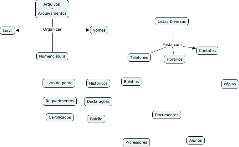 Esse mapa conceitual, produzido no IHMC CmapTools, tem a informação relacionada a: Secretaria, Listas Diversas Pasta com Horários, Arquivos e Arquivamentos Organizar Nomenclatura, Listas Diversas Pasta com Contatos, Arquivos e Arquivamentos Organizar Local, Arquivos e Arquivamentos Organizar Nomes, Listas Diversas Pasta com Telefones