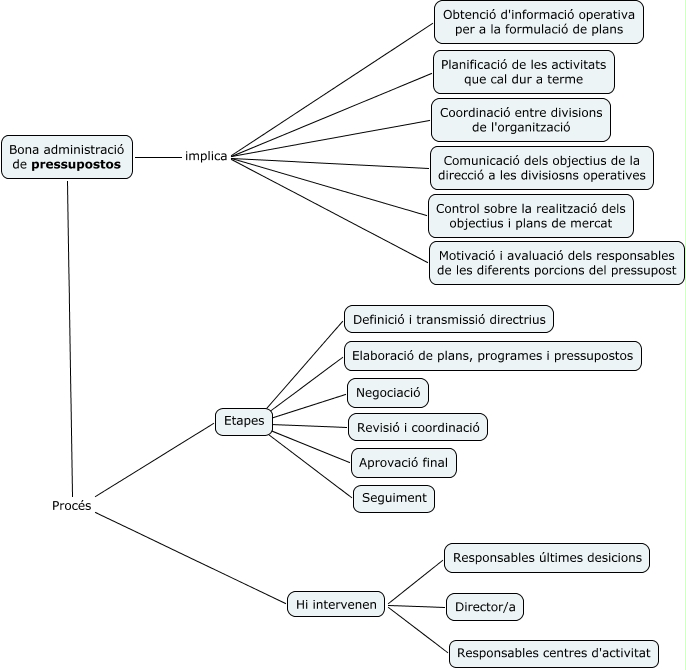 Aquest mapa conceptual conté informació relacionada amb: Pressupostos - Característiques econòmiques (gestió i sistemes), Bona administració de pressupostos Procés Etapes, Bona administració de pressupostos implica Coordinació entre divisions de l'organització, Hi intervenen ???? Responsables centres d'activitat, Bona administració de pressupostos Procés Hi intervenen, Hi intervenen ???? Responsables últimes desicions, Bona administració de pressupostos implica Comunicació dels objectius de la direcció a les divisiosns operatives, Hi intervenen ???? Director/a, Bona administració de pressupostos implica Control sobre la realització dels objectius i plans de mercat, Etapes ???? Definició i transmissió directrius, Etapes ???? Negociació, Bona administració de pressupostos implica Planificació de les activitats que cal dur a terme, Etapes ???? Revisió i coordinació, Etapes ???? Elaboració de plans, programes i pressupostos, Etapes ???? Seguiment, Etapes ???? Aprovació final, Bona administració de pressupostos implica Motivació i avaluació dels responsables de les diferents porcions del pressupost, Bona administració de pressupostos implica Obtenció d'informació operativa per a la formulació de plans