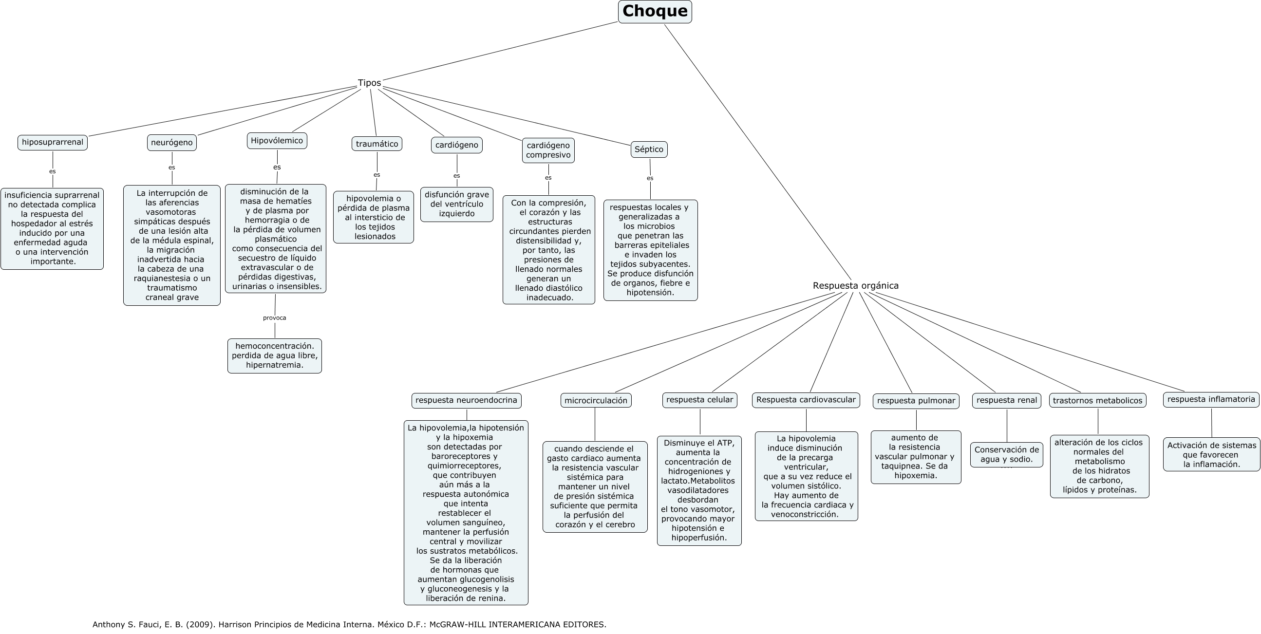 Este Cmap, tiene información relacionada con: choque, respuesta celular ???? Disminuye el ATP, aumenta la concentración de hidrogeniones y lactato.Metabolitos vasodilatadores desbordan el tono vasomotor, provocando mayor hipotensión e hipoperfusión., Respuesta cardiovascular ???? La hipovolemia induce disminución de la precarga ventricular, que a su vez reduce el volumen sistólico. Hay aumento de la frecuencia cardiaca y venoconstricción., microcirculación ???? cuando desciende el gasto cardiaco aumenta la resistencia vascular sistémica para mantener un nivel de presión sistémica suficiente que permita la perfusión del corazón y el cerebro, neurógeno es La interrupción de las aferencias vasomotoras simpáticas después de una lesión alta de la médula espinal, la migración inadvertida hacia la cabeza de una raquianestesia o un traumatismo craneal grave, disminución de la masa de hematíes y de plasma por hemorragia o de la pérdida de volumen plasmático como consecuencia del secuestro de líquido extravascular o de pérdidas digestivas, urinarias o insensibles. provoca hemoconcentración. perdida de agua libre, hipernatremia., Choque Respuesta orgánica respuesta renal, Choque Tipos hiposuprarrenal, Séptico es respuestas locales y generalizadas a los microbios que penetran las barreras epiteliales e invaden los tejidos subyacentes. Se produce disfunción de organos, fiebre e hipotensión., respuesta pulmonar ???? aumento de la resistencia vascular pulmonar y taquipnea. Se da hipoxemia., respuesta renal ???? Conservación de agua y sodio., Choque Respuesta orgánica respuesta celular, Choque Tipos cardiógeno, traumático es hipovolemia o pérdida de plasma al intersticio de los tejidos lesionados, Choque Respuesta orgánica Respuesta cardiovascular, Choque Tipos cardiógeno compresivo, respuesta neuroendocrina ???? La hipovolemia,la hipotensión y la hipoxemia son detectadas por baroreceptores y quimiorreceptores, que contribuyen aún más a la respuesta autonómica que intenta restablecer el volumen sanguíneo, mantener la perfusión central y movilizar los sustratos metabólicos. Se da la liberación de hormonas que aumentan glucogenolisis y gluconeogenesis y la liberación de renina., Choque Tipos Séptico, Choque Tipos Hipovólemico, Choque Respuesta orgánica respuesta inflamatoria, cardiógeno compresivo es Con la compresión, el corazón y las estructuras circundantes pierden distensibilidad y, por tanto, las presiones de llenado normales generan un llenado diastólico inadecuado.