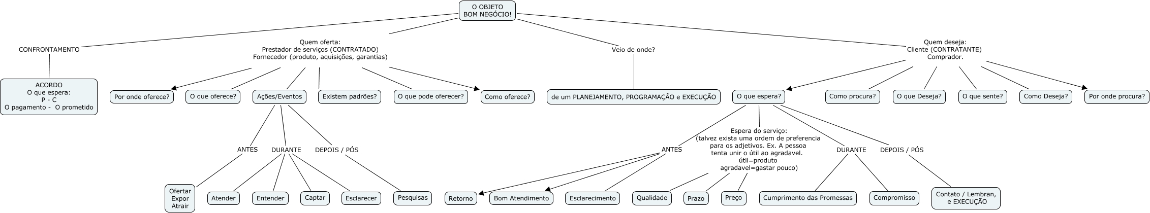 Esse mapa conceitual, produzido no IHMC CmapTools, tem a informação relacionada a: Pesquisa Cliente Prestador, O que espera? Espera do serviço: (talvez exista uma ordem de preferencia para os adjetivos. Ex. A pessoa tenta unir o útil ao agradavel. útil=produto agradavel=gastar pouco) Qualidade, O OBJETO BOM NEGÓCIO! Quem oferta: Prestador de serviços (CONTRATADO) Fornecedor (produto, aquisições, garantias) Como oferece?, O que espera? ANTES Retorno, O OBJETO BOM NEGÓCIO! Quem oferta: Prestador de serviços (CONTRATADO) Fornecedor (produto, aquisições, garantias) O que oferece?, O OBJETO BOM NEGÓCIO! Quem deseja: Cliente (CONTRATANTE) Comprador. Como Deseja?, O que espera? Espera do serviço: (talvez exista uma ordem de preferencia para os adjetivos. Ex. A pessoa tenta unir o útil ao agradavel. útil=produto agradavel=gastar pouco) Prazo, O OBJETO BOM NEGÓCIO! Quem deseja: Cliente (CONTRATANTE) Comprador. O que espera?, O OBJETO BOM NEGÓCIO! Quem deseja: Cliente (CONTRATANTE) Comprador. O que Deseja?, Ações/Eventos DURANTE Entender, O OBJETO BOM NEGÓCIO! Quem oferta: Prestador de serviços (CONTRATADO) Fornecedor (produto, aquisições, garantias) O que pode oferecer?, O que espera? DURANTE Cumprimento das Promessas, O OBJETO BOM NEGÓCIO! Quem deseja: Cliente (CONTRATANTE) Comprador. Como procura?, Ações/Eventos DURANTE Atender, Ações/Eventos DEPOIS / PÓS Pesquisas, O OBJETO BOM NEGÓCIO! Quem oferta: Prestador de serviços (CONTRATADO) Fornecedor (produto, aquisições, garantias) Por onde oferece?, Ações/Eventos DURANTE Esclarecer, Ações/Eventos ANTES Ofertar Expor Atrair, O OBJETO BOM NEGÓCIO! CONFRONTAMENTO ACORDO O que espera: P - C O pagamento - O prometido, O que espera? ANTES Esclarecimento, O que espera? DURANTE Compromisso