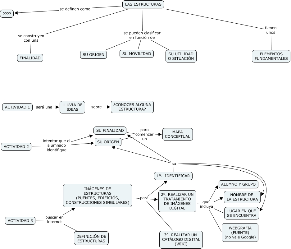 Este Cmap, tiene información relacionada con: estructuras_inicio, 2º. REALIZAR UN TRATAMIENTO DE IMÁGENES DIGITAL que incluya WEBGRAFÍA (FUENTE) (no vale Google), SU ORIGEN para comenzar un MAPA CONCEPTUAL, IMÁGENES DE ESTRUCTURAS (PUENTES, EDIFICIÓS, CONSTRUCCIONES SINGULARES) para 3º. REALIZAR UN CATÁLOGO DIGITAL (WIKI), LAS ESTRUCTURAS tienen unos ELEMENTOS FUNDAMENTALES, ACTIVIDAD 2 intentar que el alumnado identifique SU ORIGEN, LAS ESTRUCTURAS se construyen con una FINALIDAD, ACTIVIDAD 3 buscar en internet DEFINICIÓN DE ESTRUCTURAS, ACTIVIDAD 3 buscar en internet IMÁGENES DE ESTRUCTURAS (PUENTES, EDIFICIÓS, CONSTRUCCIONES SINGULARES), ACTIVIDAD 2 intentar que el alumnado identifique SU FINALIDAD, LAS ESTRUCTURAS se pueden clasificar en función de SU ORIGEN, IMÁGENES DE ESTRUCTURAS (PUENTES, EDIFICIÓS, CONSTRUCCIONES SINGULARES) para 2º. REALIZAR UN TRATAMIENTO DE IMÁGENES DIGITAL, LAS ESTRUCTURAS se pueden clasificar en función de SU MOVILIDAD, 2º. REALIZAR UN TRATAMIENTO DE IMÁGENES DIGITAL que incluya ALUMNO Y GRUPO, LAS ESTRUCTURAS se definen como ????, ACTIVIDAD 1 será una LLUVIA DE IDEAS, LLUVIA DE IDEAS sobre ¿CONOCES ALGUNA ESTRUCTURA?, 1º. IDENTIFICAR su LUGAR EN QUE SE ENCUENTRA, 2º. REALIZAR UN TRATAMIENTO DE IMÁGENES DIGITAL que incluya NOMBRE DE LA ESTRUCTURA, 1º. IDENTIFICAR su SU FINALIDAD, IMÁGENES DE ESTRUCTURAS (PUENTES, EDIFICIÓS, CONSTRUCCIONES SINGULARES) para 1º. IDENTIFICAR