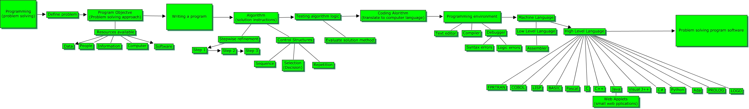 This Concept Map, created with IHMC CmapTools, has information related to: COONS, ELLIOT, High Level Language BASIC, Algorithm (solution instructions) Stepwise refinement, High Level Language Java, Machine Language Low Level Language, Programming environment Machine Language, Programming environment Compiler, Writing a program Algorithm (solution instructions), High Level Language C++, Low Level Language Assembler, Java Web Applets (small web pplications), Algorithm (solution instructions) Testing algorithm logic, High Level Language Pascal, Resources available Computer, Testing algorithm logic Coding Alorithm (translate to computer language), Control Structures Sequence, Debugger Logic errors, Resources available Data, Debugger Syntax errors, Control Structures Repetition, High Level Language PROLOG