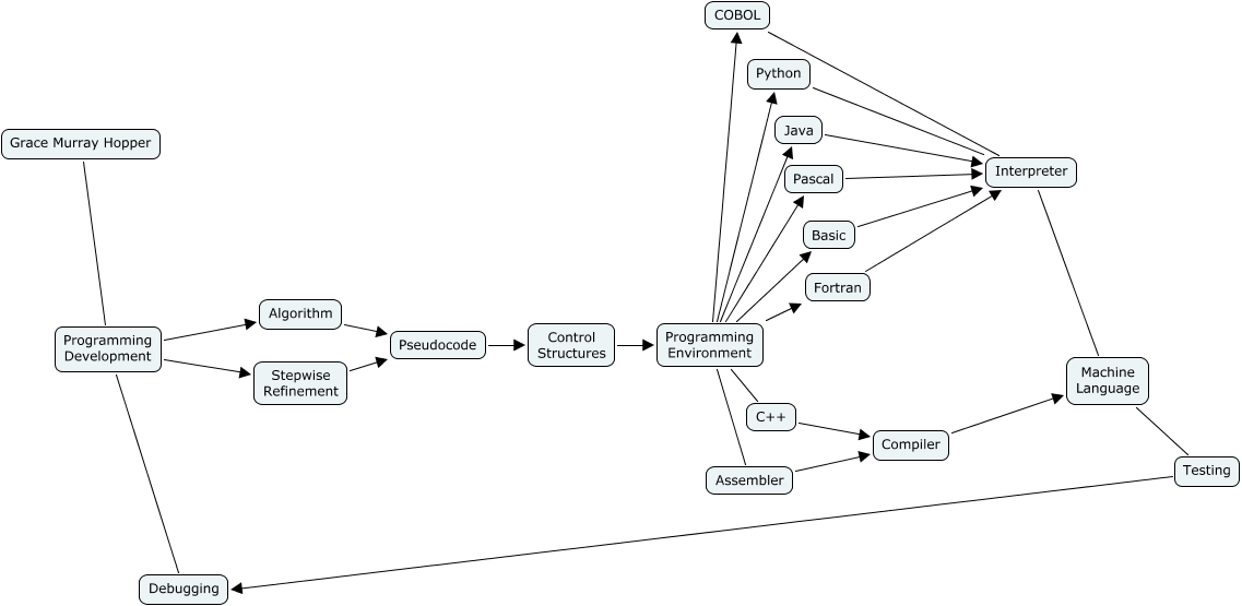 This Concept Map, created with IHMC CmapTools, has information related to: KETTENHOFEN, MARK, Programming Environment Assembler, Fortran Interpreter, Programming Development Stepwise Refinement, Programming Environment Basic, Testing Debugging, COBOL Interpreter, Algorithm Pseudocode, Programming Environment COBOL, Stepwise Refinement Pseudocode, Python Interpreter, Programming Development Debugging, C++ Compiler, Programming Environment C++, Programming Environment Python, Assembler Compiler, Programming Environment Java, Programming Environment Fortran, Control Structures Programming Environment, Interpreter Machine Language, Pascal Interpreter