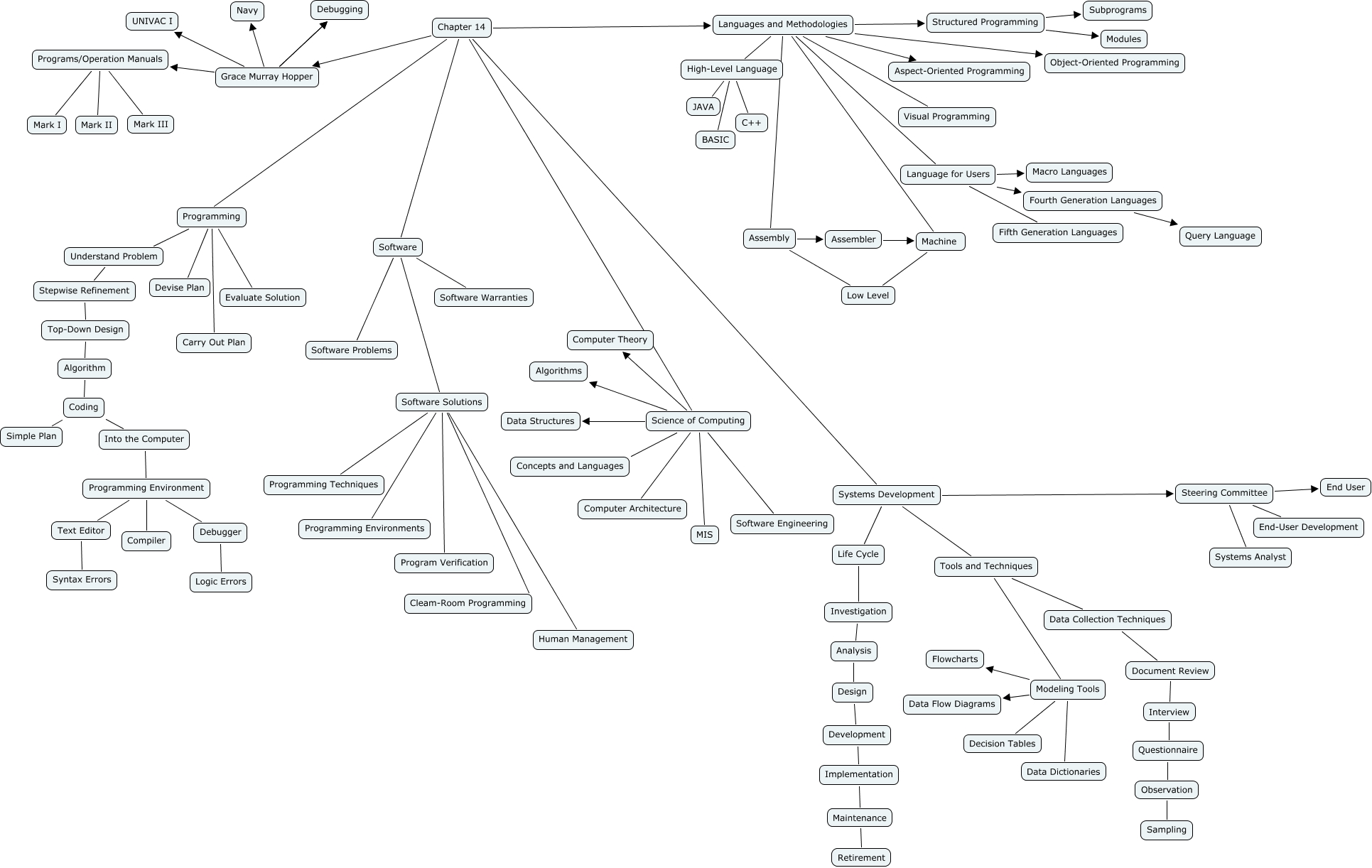 This Concept Map, created with IHMC CmapTools, has information related to: GREEN, JASMINE, Understand Problem Stepwise Refinement, Stepwise Refinement Top-Down Design, Steering Committee Systems Analyst, Tools and Techniques Data Collection Techniques, Software Solutions Cleam-Room Programming, Structured Programming Modules, Life Cycle Investigation, Programming Devise Plan, Chapter 14 Languages and Methodologies, Into the Computer Programming Environment, Fourth Generation Languages Query Language, Modeling Tools Flowcharts, Programs/Operation Manuals Mark II, Modeling Tools Decision Tables, Science of Computing MIS, Programming Understand Problem, Languages and Methodologies High-Level Language, Software Solutions Programming Techniques, Observation Sampling, Modeling Tools Data Dictionaries