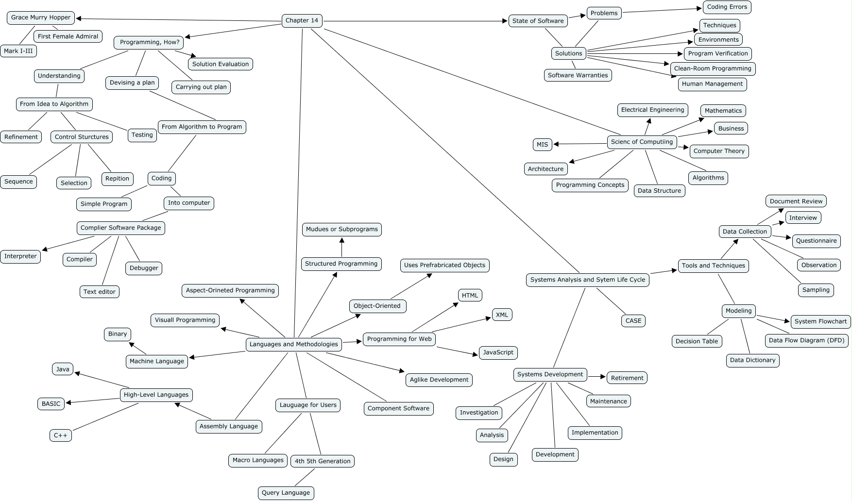 This Concept Map, created with IHMC CmapTools, has information related to: REED, ROSS, Chapter 14 Systems Analysis and Sytem Life Cycle, Tools and Techniques Modeling, Coding Simple Program, High-Level Languages Java, Complier Software Package Interpreter, Languages and Methodologies Aspect-Orineted Programming, Complier Software Package Text editor, Systems Development Retirement, Systems Development Implementation, Solutions Program Verification, From Algorithm to Program Coding, Devising a plan From Algorithm to Program, Languages and Methodologies Lauguage for Users, Programming, How? Devising a plan, State of Software Solutions, Data Collection Questionnaire, Systems Development Maintenance, Programming for Web JavaScript, Into computer Complier Software Package, Data Collection Observation