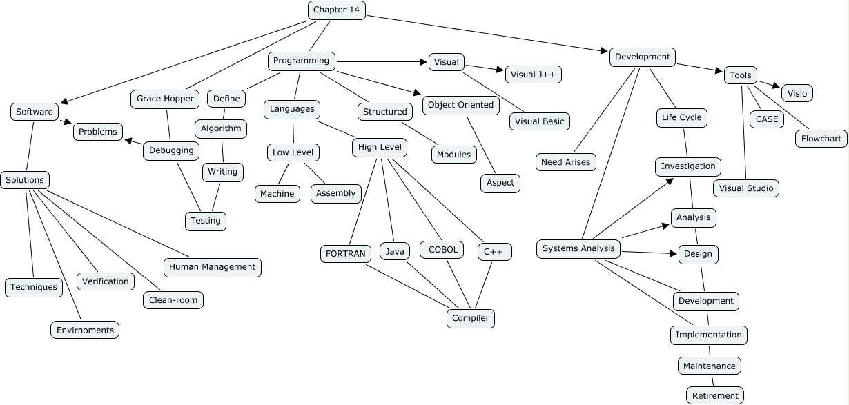 This Concept Map, created with IHMC CmapTools, has information related to: SCHETGEN, MICHAEL, Writing Testing, Solutions Human Management, Maintenance Retirement, Systems Analysis Development, Solutions Verification, Development Tools, Programming Structured, Development Implementation, Languages Low Level, FORTRAN Compiler, Low Level Assembly, Systems Analysis Analysis, Chapter 14 Development, Programming Define, Tools Visio, Systems Analysis Design, Investigation Analysis, Programming Visual, Tools CASE, Algorithm Writing