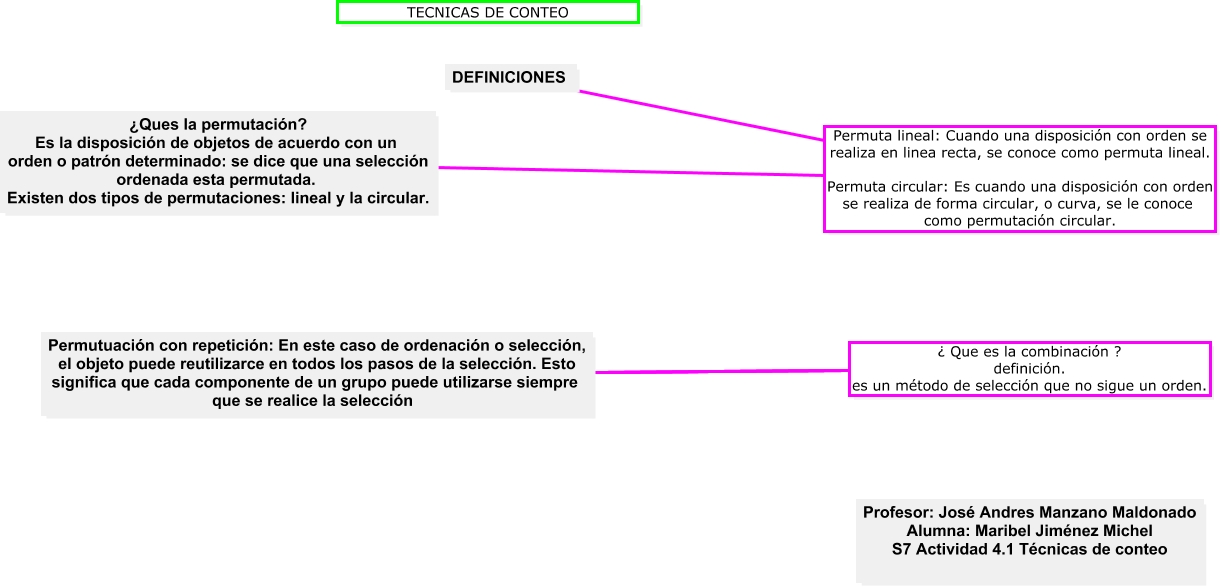 Este Cmap, tiene información relacionada con: cuadro sinoptico, ¿Ques la permutación? Es la disposición de objetos de acuerdo con un orden o patrón determinado: se dice que una selección ordenada esta permutada. Existen dos tipos de permutaciones: lineal y la circular. Permuta lineal: Cuando una disposición con orden se realiza en linea recta, se conoce como permuta lineal. Permuta circular: Es cuando una disposición con orden se realiza de forma circular, o curva, se le conoce como permutación circular. DEFINICIONES