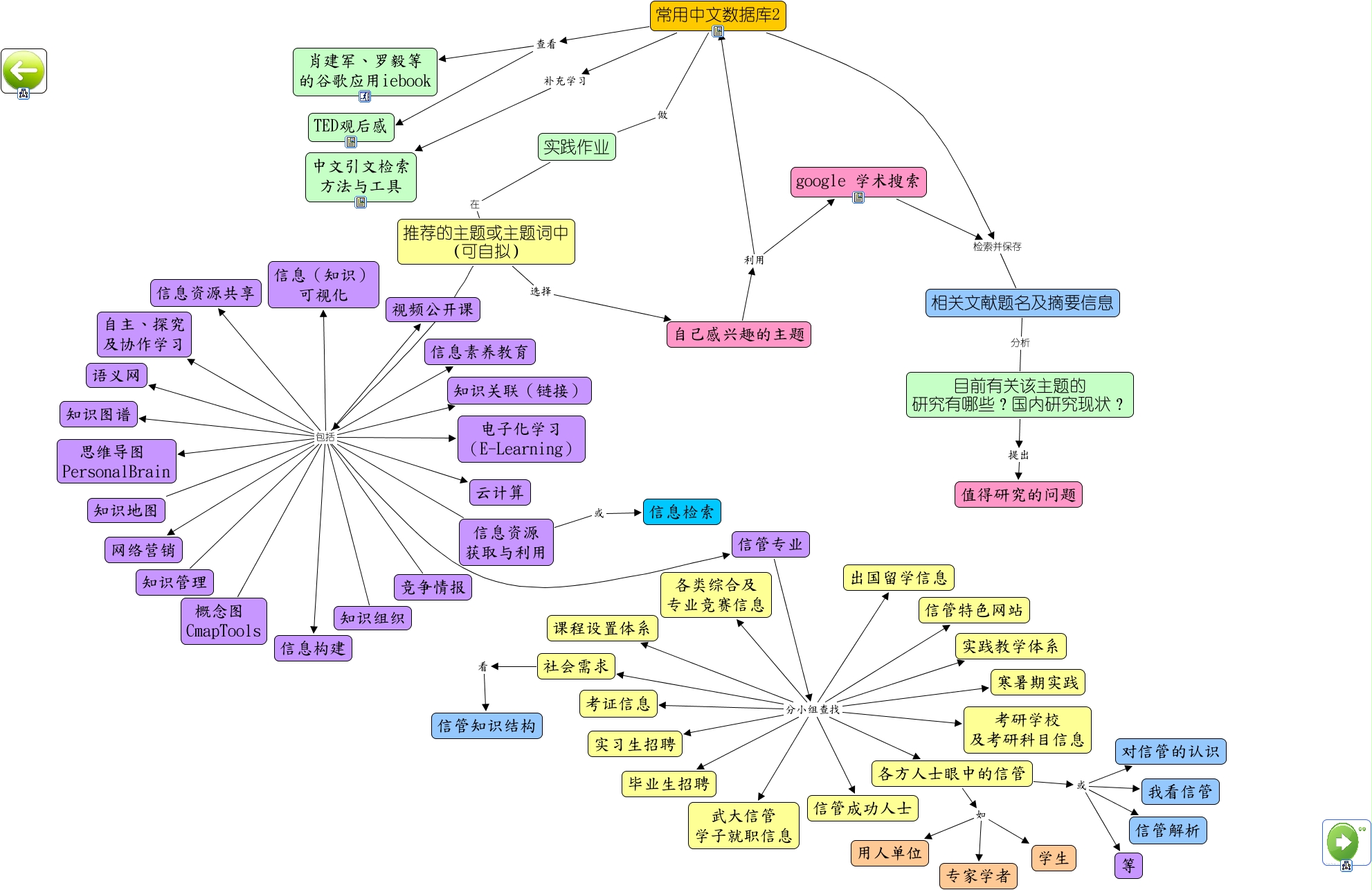 此概念图以 IHMC CmapTools 创建, 内含信息有关于: 第九专题 常用中文库2, 相关文献题名及摘要信息 分析 目前有关该主题的 研究有哪些?国内研究现状?, google 学术搜索 检索并保存 相关文献题名及摘要信息, 推荐的主题或主题词中 (可自拟) 包括 自主、探究 及协作学习, 信管专业 分小组查找 出国留学信息, 信管专业 分小组查找 武大信管 学子就职信息, 信管专业 分小组查找 实习生招聘, 社会需求 看 信管知识结构, 常用中文数据库2 查看 TED观后感, 常用中文数据库2 补充学习 中文引文检索 方法与工具, 自己感兴趣的主题 利用 google 学术搜索, 各方人士眼中的信管 或 我看信管, 推荐的主题或主题词中 (可自拟) 包括 思维导图 PersonalBrain, 推荐的主题或主题词中 (可自拟) 包括 知识地图, 常用中文数据库2 做 实践作业, 推荐的主题或主题词中 (可自拟) 包括 知识图谱, 信管专业 分小组查找 寒暑期实践, 常用中文数据库2 检索并保存 相关文献题名及摘要信息, 各方人士眼中的信管 或 信管解析, 各方人士眼中的信管 如 专家学者, 各方人士眼中的信管 或 对信管的认识