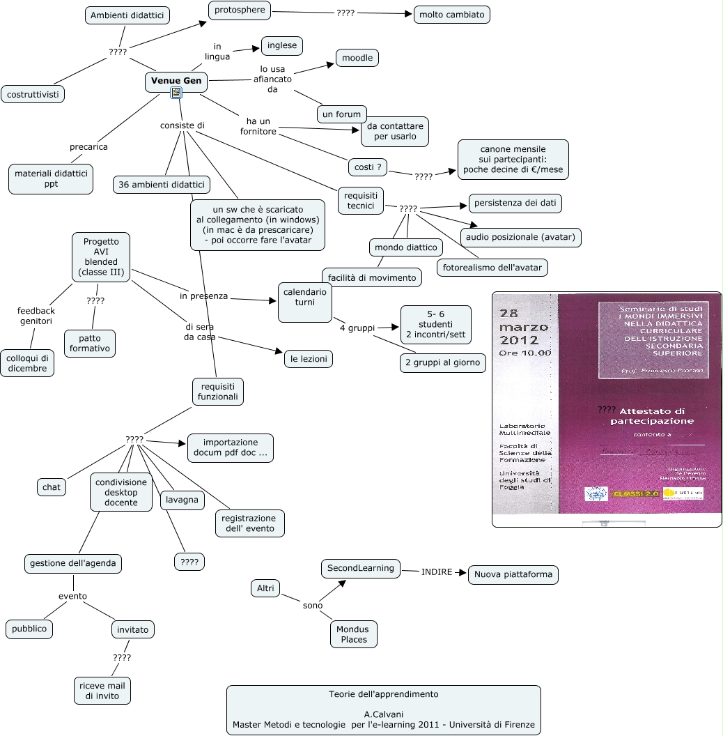 Questa Cmap, creata con IHMC CmapTools, contiene informazioni relative a: Ambienti didattici, Venue Gen consiste di 36 ambienti didattici, invitato ???? riceve mail di invito, Progetto AVI blended (classe III) in presenza calendario turni, requisiti tecnici ???? fotorealismo dell'avatar, Ambienti didattici ???? Venue Gen, Ambienti didattici ???? protosphere, Altri sono SecondLearning, requisiti funzionali ???? gestione dell'agenda, requisiti tecnici ???? persistenza dei dati, calendario turni 4 gruppi 2 gruppi al giorno, requisiti tecnici ???? facilità di movimento, costi ? ???? canone mensile sui partecipanti: poche decine di €/mese, calendario turni 4 gruppi 5- 6 studenti 2 incontri/sett, requisiti tecnici ???? mondo diattico, Venue Gen precarica materiali didattici ppt, Altri sono Mondus Places, Venue Gen consiste di requisiti tecnici, gestione dell'agenda evento invitato, requisiti funzionali ???? registrazione dell' evento, Venue Gen consiste di un sw che è scaricato al collegamento (in windows) (in mac è da prescaricare) - poi occorre fare l'avatar