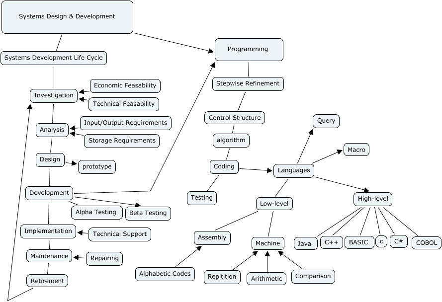 This Concept Map, created with IHMC CmapTools, has information related to: Squeri, Nicholas Team 7 Part two, Technical Feasability Investigation, Languages Low-level, High-level BASIC, Stepwise Refinement Control Structure, Analysis Design, Languages Query, Arithmetic Machine, Comparison Machine, High-level COBOL, High-level Java, Input/Output Requirements Analysis, Control Structure algorithm, Coding Testing, Design Development, Retirement Investigation, Low-level Assembly, Development Programming, High-level C#, Development Implementation, Systems Design & Development Systems Development Life Cycle